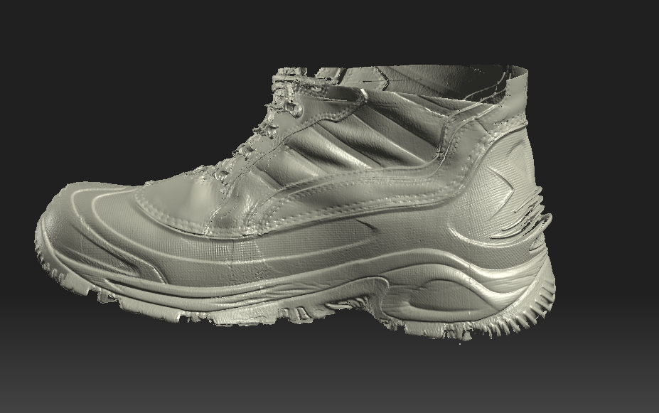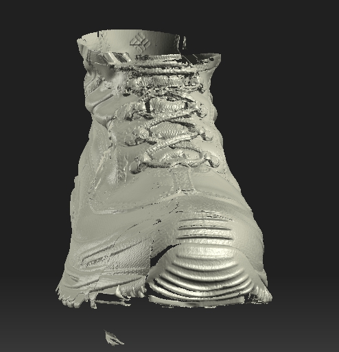 ботинок был пересобран из тех же сканов, но используя больше возможностей программы. Как оказалось результат очень не плохой. Расхождений почти нет, ито уверен можно и это поправить, просто не хватает некоторых ракурсов, всего сканов 25.Так много, потомучто лапа у меня большая а область сканирования была 120мм