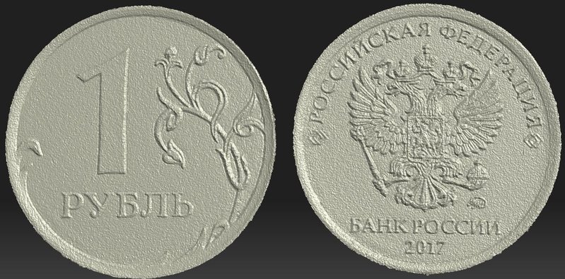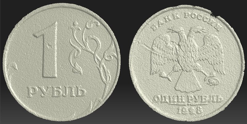 Специально отысканная в кармане немного потемневшая монета достоиством 1 рубль всё равно оказалась слишком "блестящей", и при этом весьма "покоцанной". Однако сканер "взял" её (даже клеймо вышло ;) )