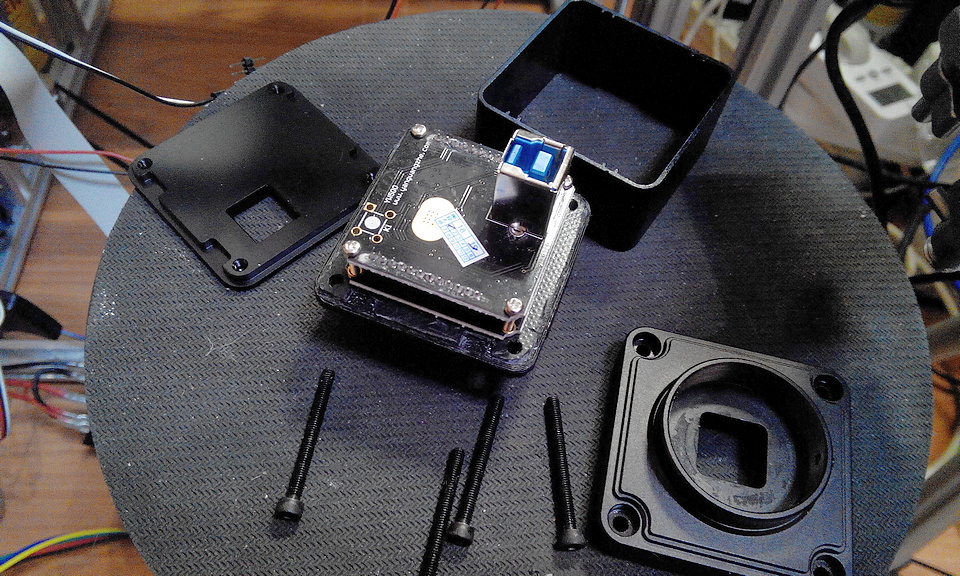 Почему-то на домашнем стареньком компе она не захотела работать по USB2.0 на разрешениях выше 1600х1200. Ну пока и так сойдёт. Конечно, опять пришлось "помоделировать и попечатать", чтобы нормально присоединить неподходящий объектив. Из-за особенностей конструкции пришлось сделать новую переднюю крышку корпуса камеры.