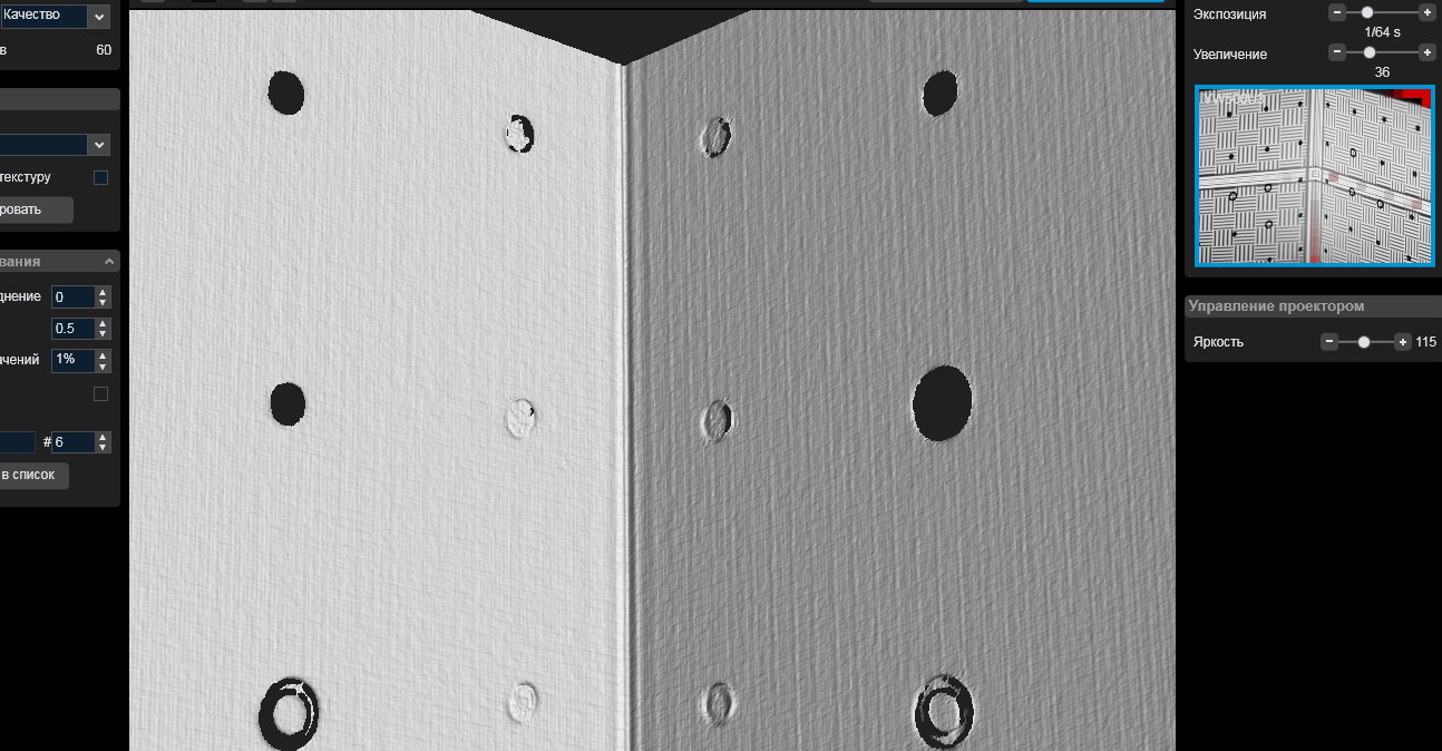 Скорость сканирования на моём стареньком компе, по сравнению с Toupcam UCMOS03100KPA, увеличилась в два раза (один скан 25сек). Причём (что мне пока непонятно) режим "Качество" (60 паттернов) сканируется всего лишь на 5сек. дольше, чем "Скорость" (40 паттернов). Хотя пока ещё не избавился от "шума":