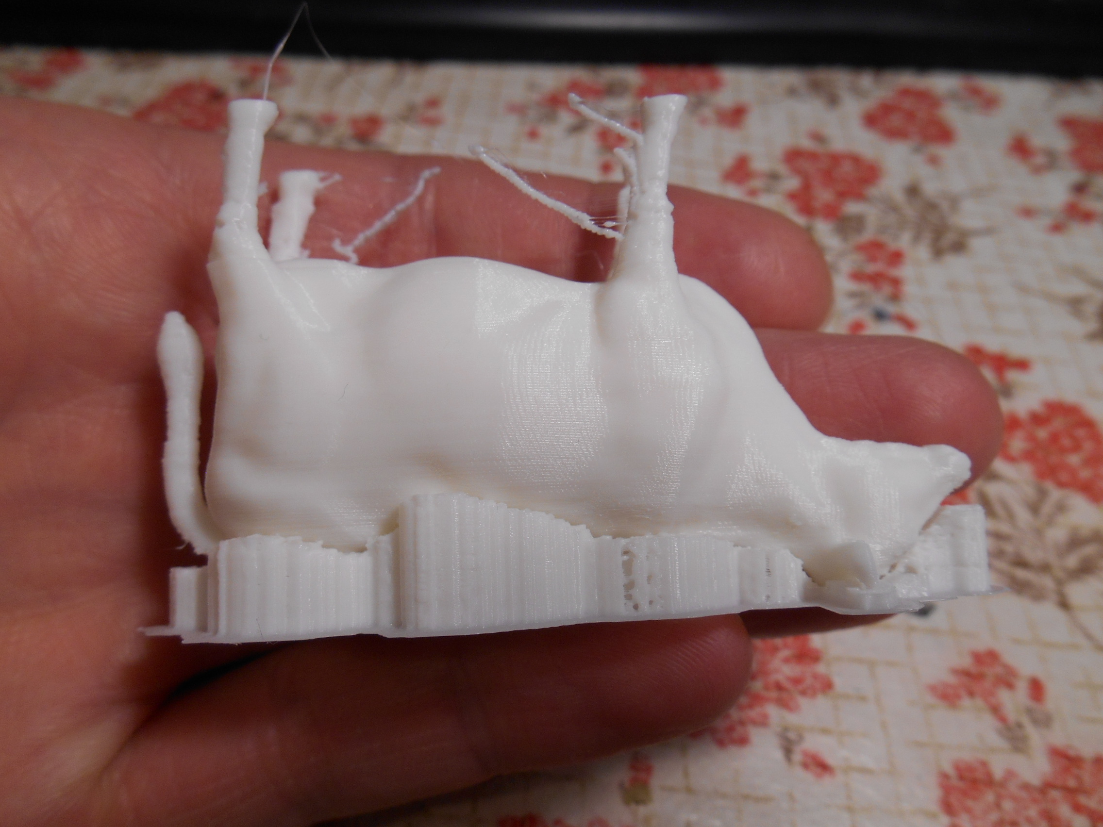 В случае с коровой, я бы попробовал напечатать ее стоя на ногах - в этом случае все косяки от поддержек были бы скрыты под брюхом и шеей.