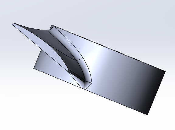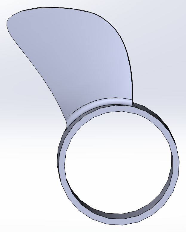 Смоделировал лопасть в Солиде. Профиль взял плоско-выпуклый... Буду делать винт 230 мм для 5065 мотора для каяка, оптимален для скорости 7-8 км/ч. Мне больше не надо, нужна экономичность. Подскажите толщину кромки лопасти. Я сделал 2 мм, потом обточу немного.
