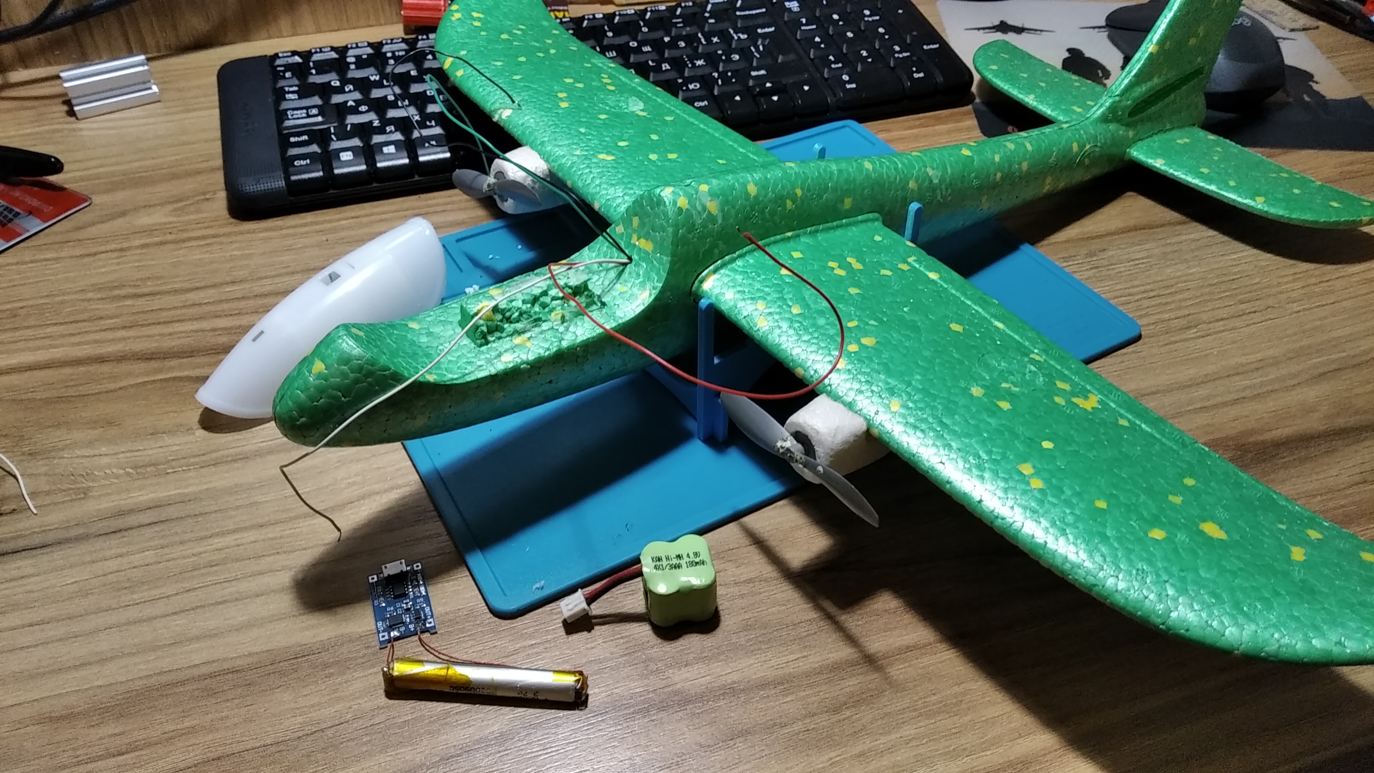 Плюс исходник питался от четырёхбаночной никель-металлгидридной батареи, итого 4,8в в номинале, или чуть больше пяти в полностью заряженном состоянии. Сейчас одна банка лития 3,6 номинал, или 4,2 максимум. Не добирают моторы оборотов, видно что надо ещё чутка добавить. Ещё до полётов, в процессе сборки, мерял обороты тахометром, по-быстрому собранным на цанговой макетке с применением Ардуино. Вышло на литие около 9500 оборотов в минуту. Надо попробовать запитаться пятью вольтами от лабораторника, и ещё раз измерить. Если разница будет заметной, можно будет переделать схему подключения батареи, добавив в цепь повышающий преобразователь, и накрутить на нём вольт эдак шесть.