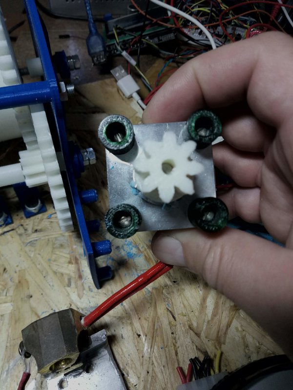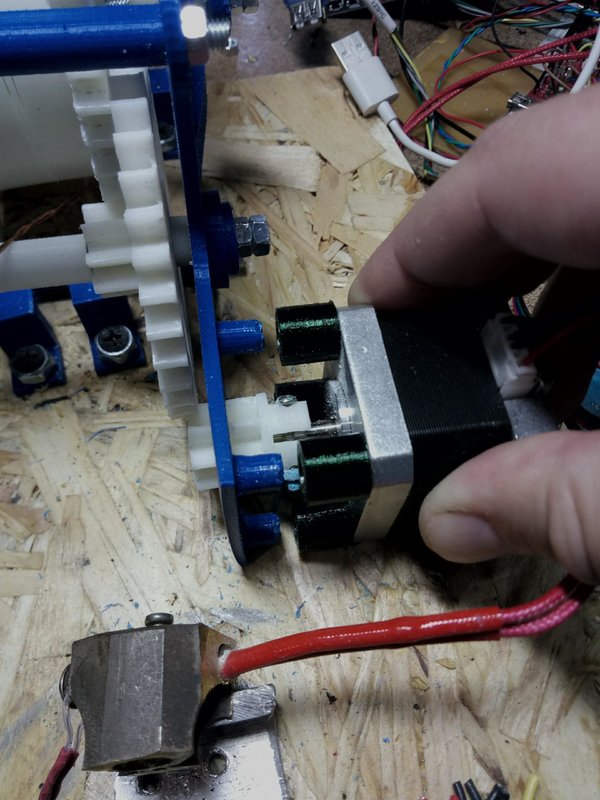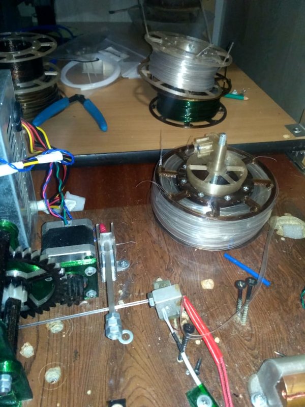 С самого начала работы со станком было неудобно разматывать готовый филамент из бобины. Я просто вытягивал его виток за витком.Разматывать реверсом мотора показалось медленнее. Думал как отключить мотор от редуктора и разматывать катушку в холостую. Пришла такая идея: снял мотор с редуктора, замерил диаметр штырьков к которым крепиься мотор, оказалось около 7 мм. Нарисовал переходные влуки с внутренним диаметром 7 мм, которые крепятся на мотор, и в месте с ним одеваются на штырьки к которым он раньше крепился. Сила трения между штырьками и втулками достаточная для удержания мотора во время работы, также не составляет особого труда для установки и снятия мотора с редукотора. Теперь сматывать филамент с бобины очнень легко, только надо придерживать бобину, а то сама разматывается быстрее, чем нужно и разлетаются витки. Если кто захочет повторить вот ссылка на файлы: https://drive.google.com/drive/folders/ ... sp=sharing