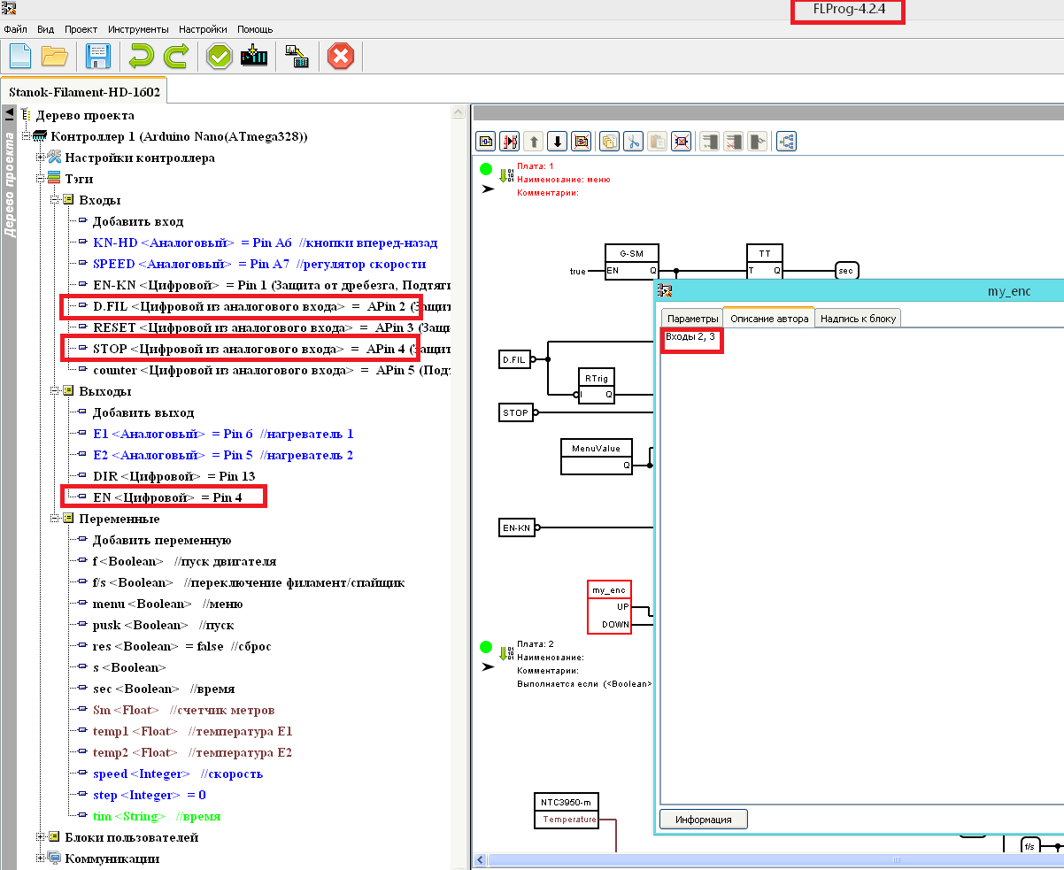 1. Если, Вы внимательно посмотрите, то увидите: «Стоп» - подключен к аналоговому пину «APin4», «EN» - подключен к цифровому пину «Pin4», «D.FIL» - подключен к аналоговому пину «APin2», «encoder» - подключен к цифровому пину «Pin2». Это совершенно разные пины.