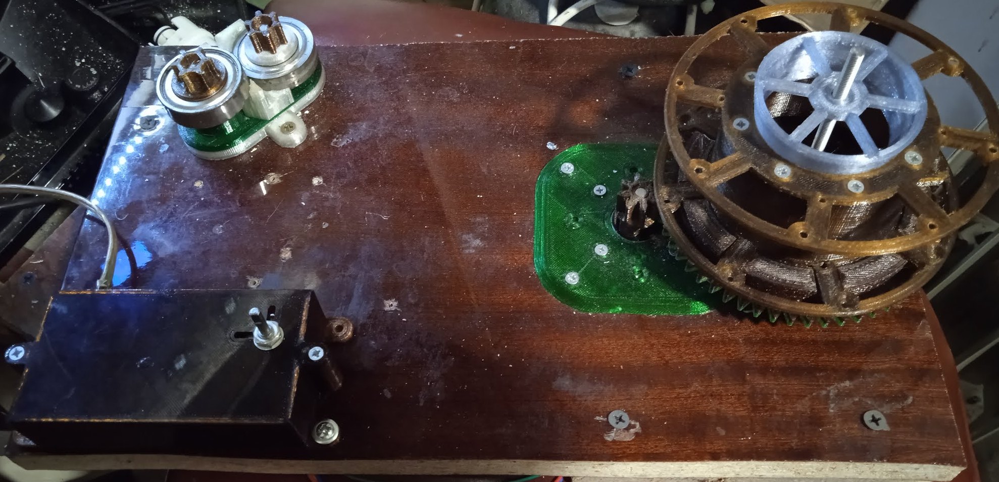 6) Для нарезки используется обычный бутылкорез из подшипников. С ним пока не все ясно. В частности не пробовал поднимать его до уровня середины катушки. Чуть позже проверю как он себя будет вести в таком исполнении. Сейчас бутылкорез прикручен просто на столик.