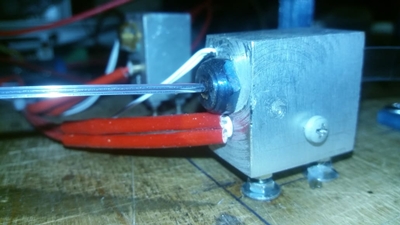 На прошлых выходных собрал хотэнд. Сначала думал из вулкана делать, а потом прикинул -- сопло все-равно желательно из стали (поэтому из винта М6) и собрал из кучи листового 1мм алюминия. Получился со сторонами 17*22*38 со входным конусом 12 мм. Попробовал вручную протянуть через него пруток - вполне протянулся.