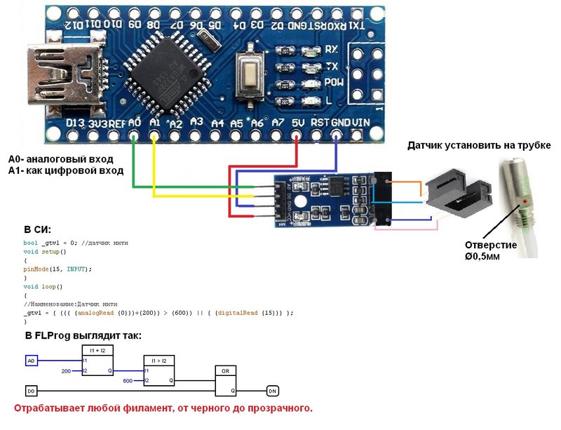5. Сигнал остановки 2 двигателя, включает команду «протяжка 2 прутка». На дисплее надпись: « жду 2 филамент » и загорается зеленый светодиод. Запускается 1 двигатель на малых оборотах. Вставляем 2 пруток. Как только 2 пруток войдет в зону ИК датчика – ИК датчик включится.