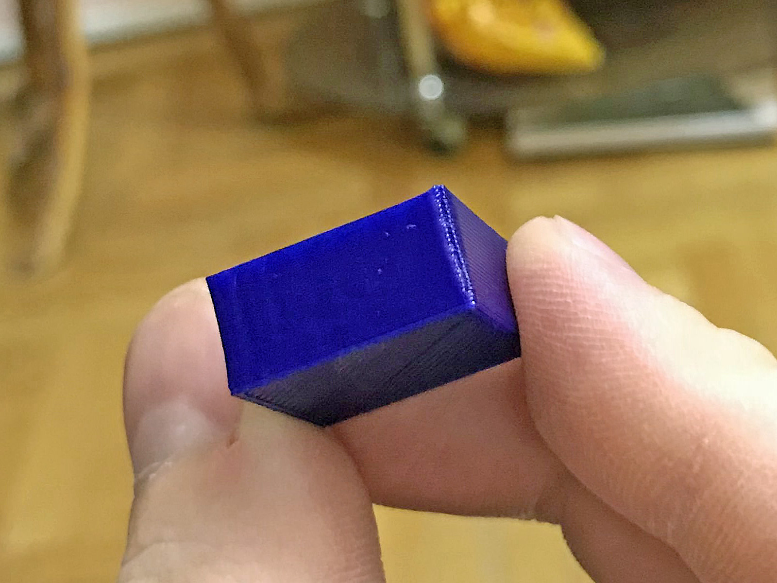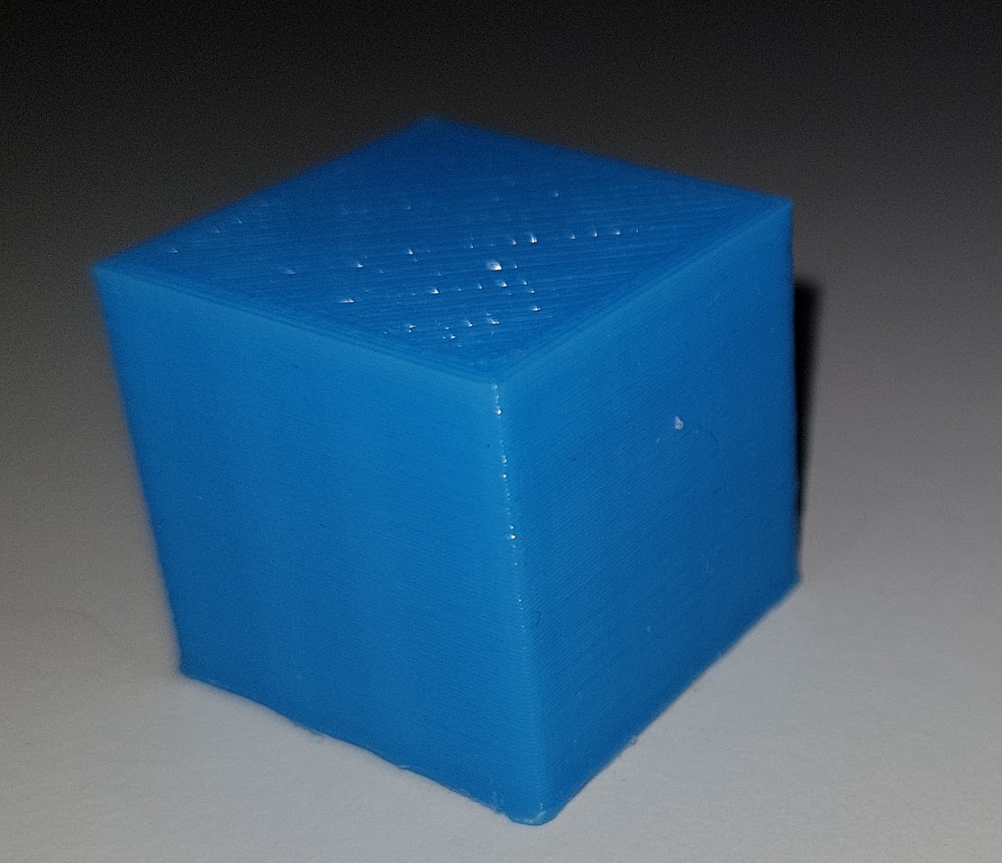 Во время печати закончился пластик, потому кубик не допечатался, но уже вполне видно, что это именно кубик. При замене пластика я протупил, и вместо выдёргивания остатков, затолкал их внутрь :( Пришлось жарить экструдер на газовой комфорке и вытапливать оставшийся пластик зубочисткой :)