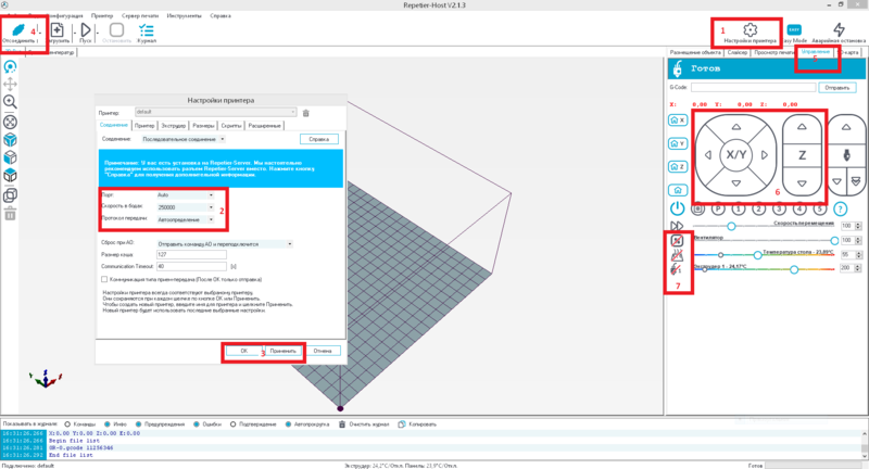 3. В «RepetierHost» зайди в настройки принтера – установи. Подключи принтер. Зайди в управление и попробуй управлять принтером с компьютера.