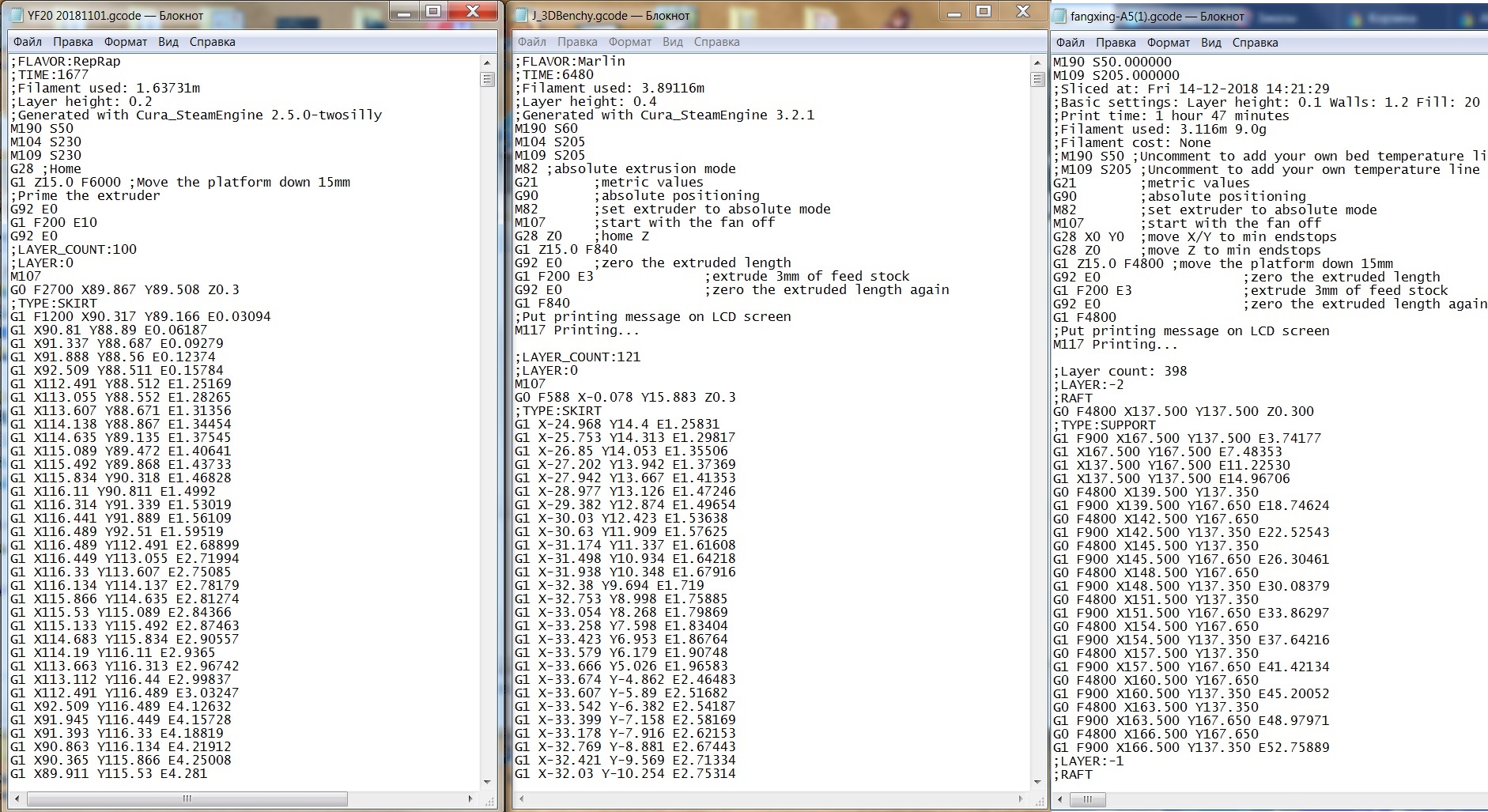 G0 это всего на всего перемещение инструмента, обычно холостое, без выдавливания пластика. Соотносить его, конечно, можно - но нужно понимать где и зачем. Для затравки - можно тут подтянуть теорию: https://reprap.org/wiki/G-code/rumagadanjey писал(а): ↑18 авг 2019, 15:19Сравнил коды всех трёх деталей, в частности координаты в строке G0