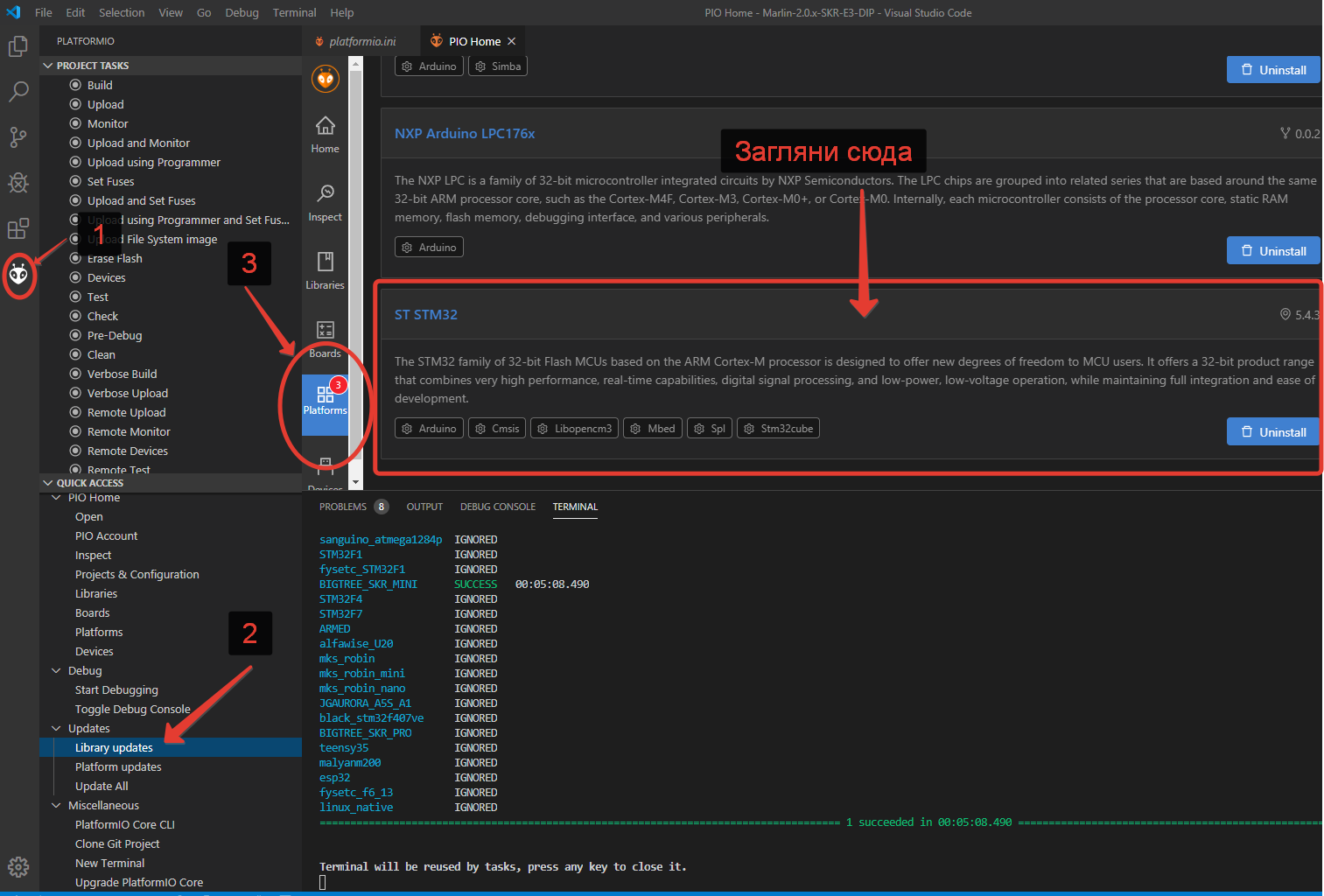 Может не из сети подгружает? Ну или глюк какой VScode... Попробуй подождать для начала, потом перезапустить. И в первую очередь закрой вторую вкладку PIO Home.