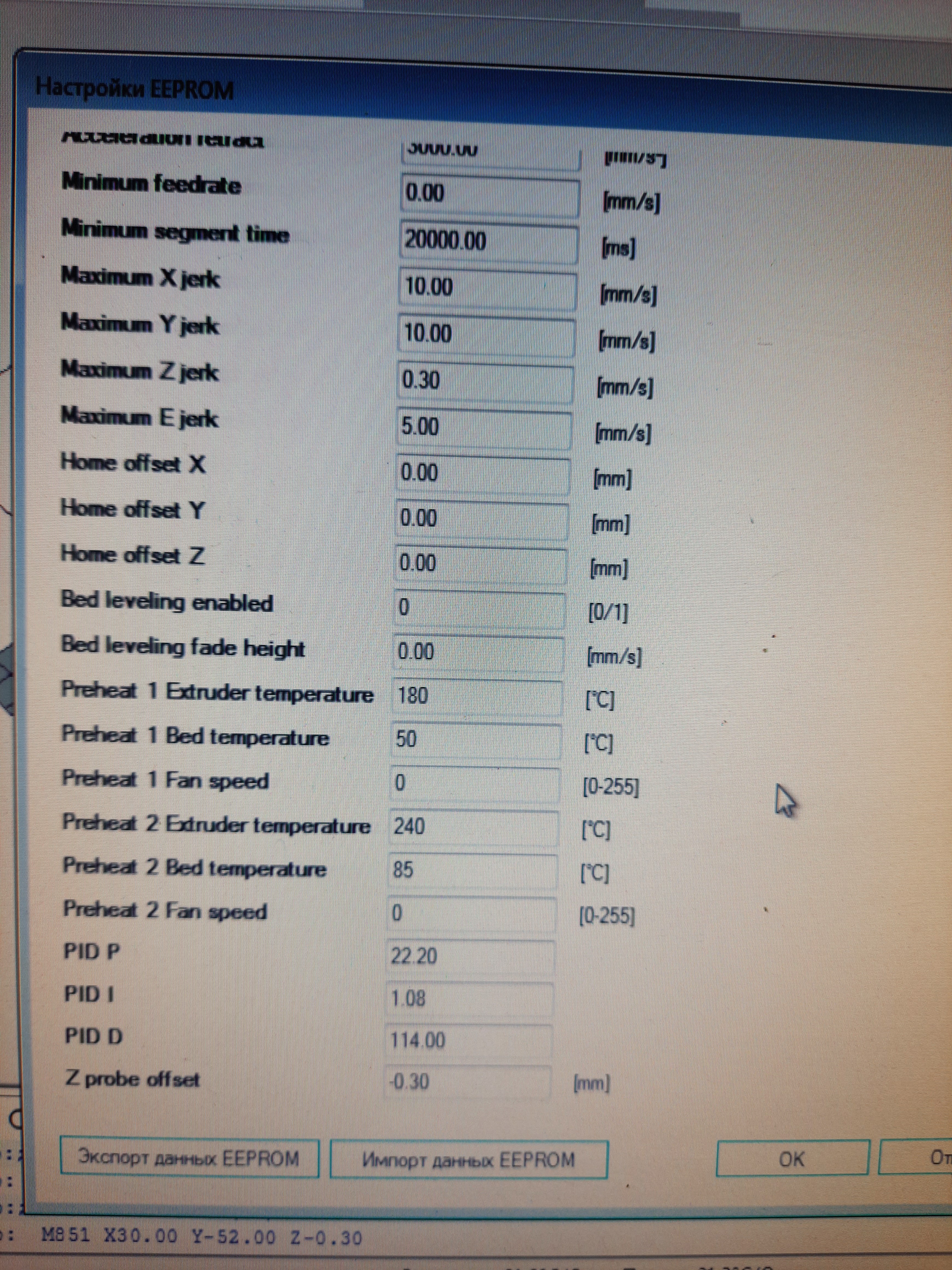 Добрый день, уважаемые форумчане. Работаю в школе учителем технологии, по гос. программе прислали в школу 3д принтер "Альфа-1", вроде как на заводе была напечатана тестовая фигура( куб). Пробная печать в школе не увенчалась успехом, информатик предложил загрузить eeprom с карты памяти принтера. Проблем стало еще больше, сначала в стол упирался (поцарапав пленку на столе), потом более менее настроили. Начал печатать, но качество просто никакое, первый слой еще как-то, а дальше просто вываливается пластик тонким слоем и все, получается сплошная паутина! Есть возможность подсказать как откалибровать eeprom в Repetier-Host или помочь удаленным доступом?