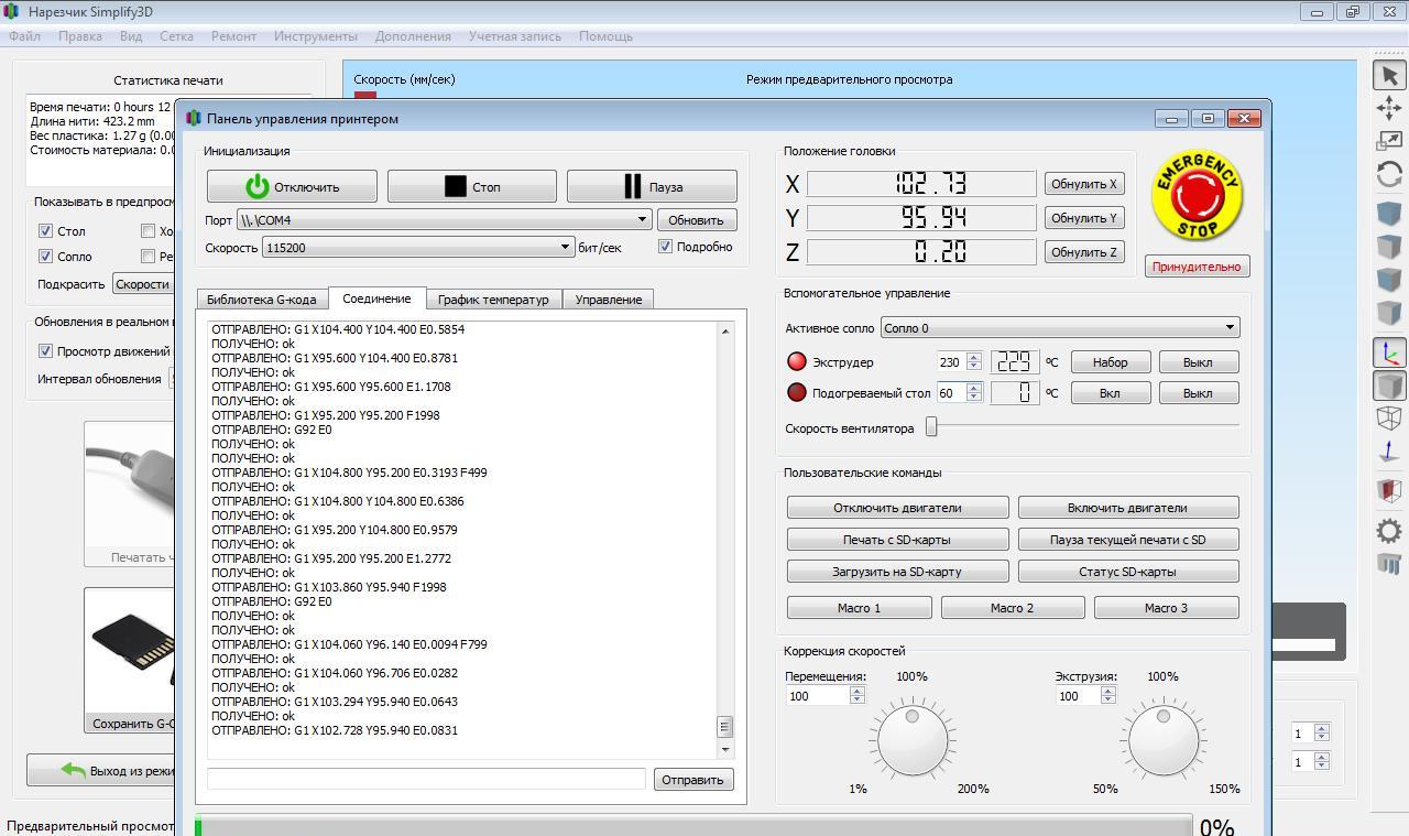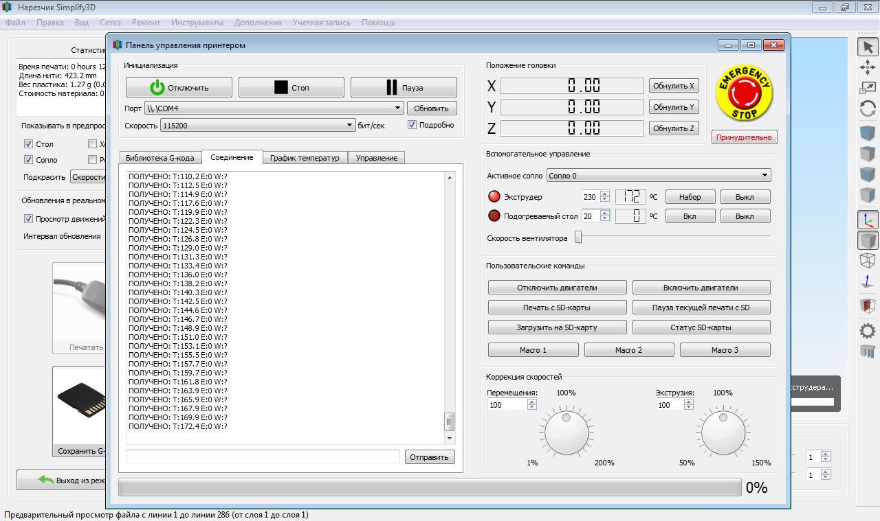 Скриншот до начала печати (прогрев экструдера) и после начала (поднимаеться только ось Z)