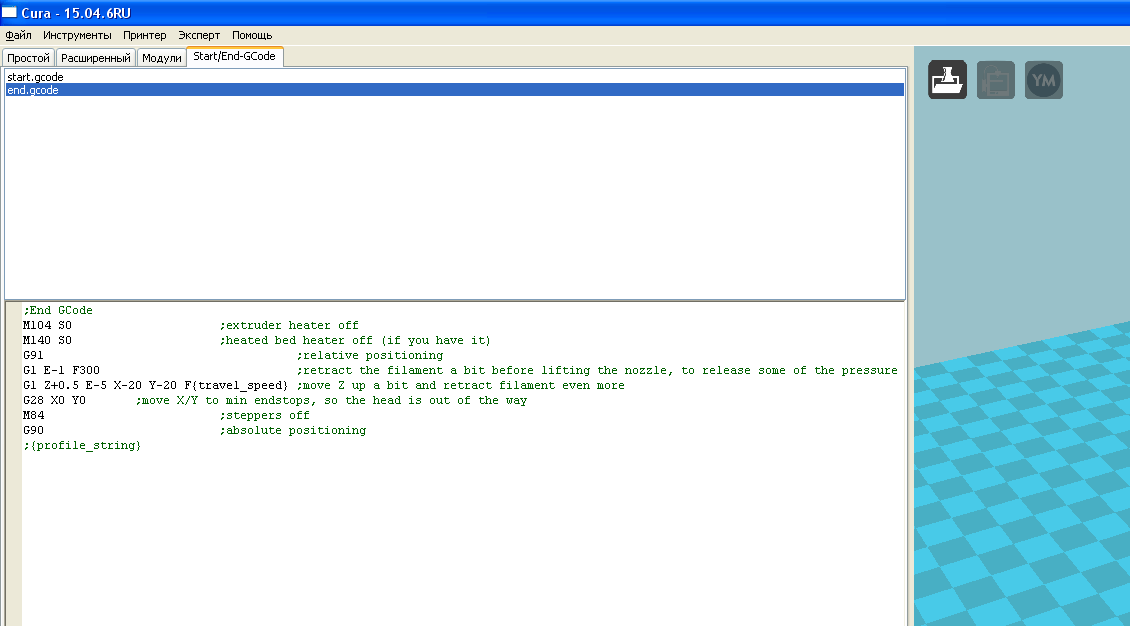 А это уже вкладка end.gcode в слайсере. В старой Куре это выглядит так: