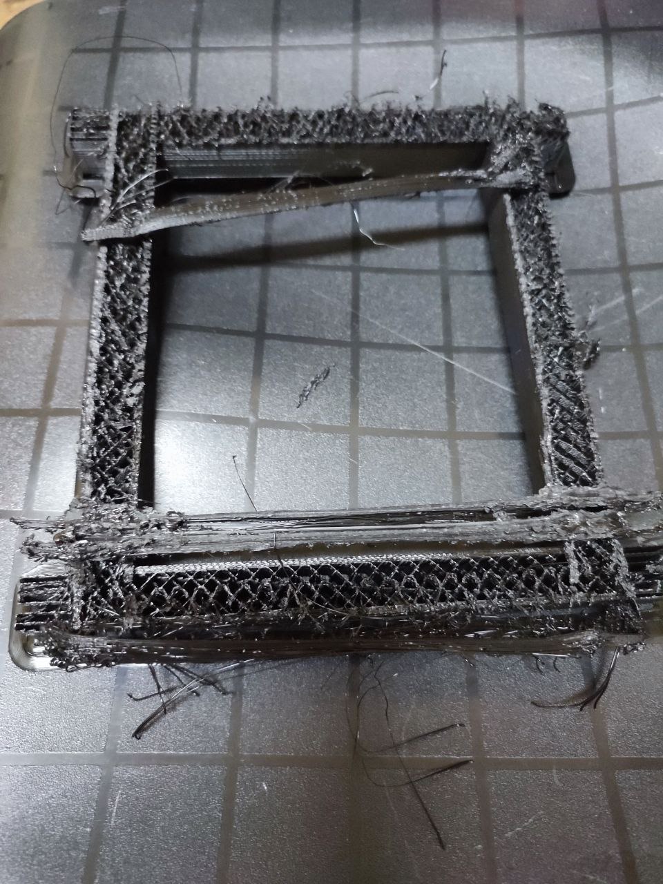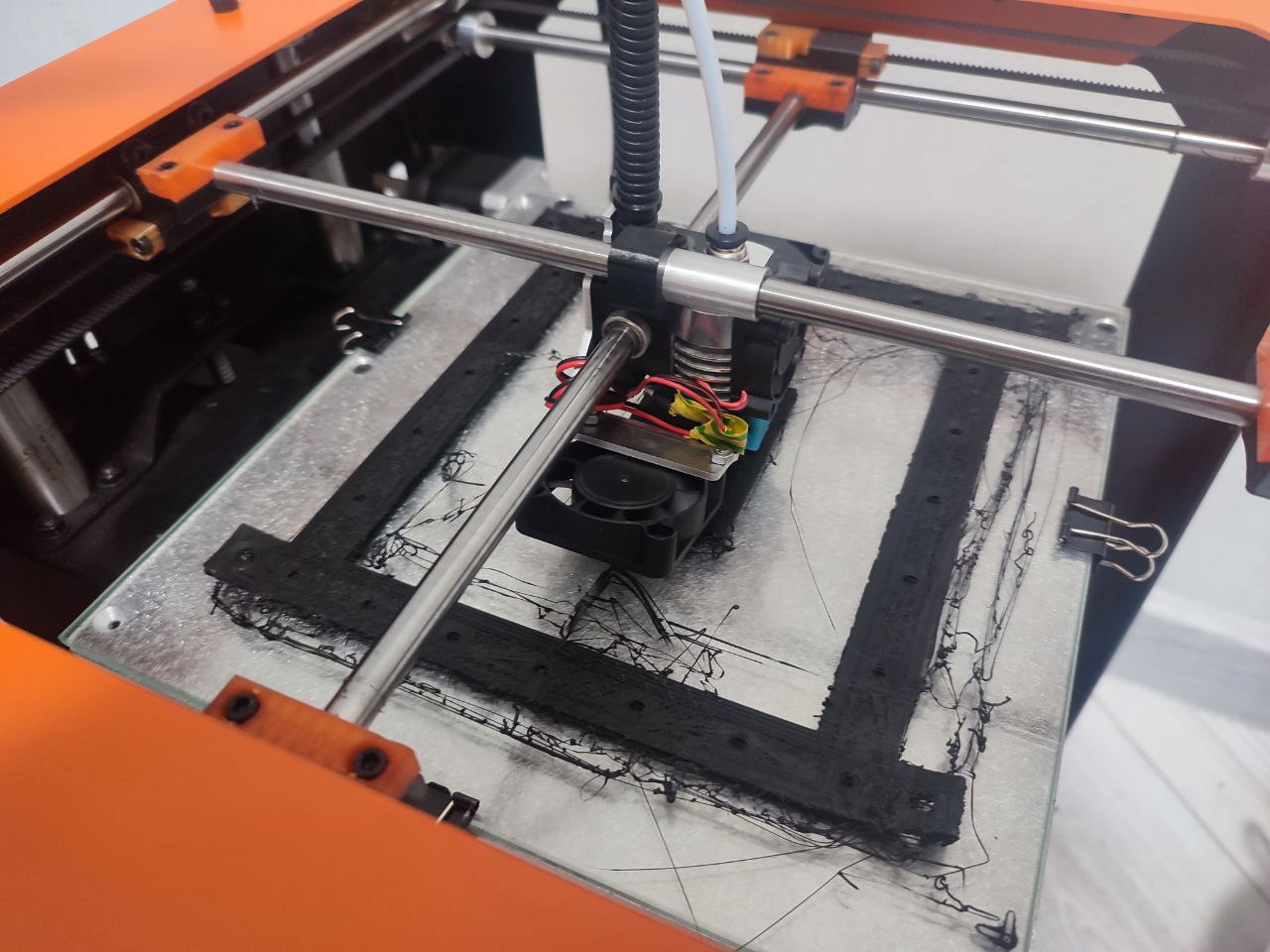 Периодически случается глюк в процессе печати. Как правило это происходит, если печать идет более 5 часов. Глюк заключается в том, что в модели происходят геометрические изменения. Похоже на то, что g-code считывается неверно. Строятся всякие дополнительные чем-то похожие на поддержки столбики рандомного диаметра, затем начинают проскальзывать слои (как буд-то бы скорость печатающей головки не соответствует скорости подачи филамента). В конце концов, печатающая головка просто начинает ходить по одной из горизонтальных осей взад вперед и выдавливает филамент, при этом ось Z не двигается. Все это приводит к аварии в процессе печати, полимер выдавливается лужей, а шаговики перестают двигать, так как экструдер застревает рано или поздно в своей луже из полилактида.. Изначально, я думал, что проблема в карте, поменял ее на 2 Gb, не помогло. Поставил ИБП, тоже без изменений. Обновил прошивку, тоже не помогло. В сети не нашел подобной проблемы. Иногда принтер начинает печатать со сдвигом в несколько см! (см. фото) Если ставить одну и ту же модель, глюк может произойти в разное время. Все кулеры работают, проблем с охлаждением не должно быть. Может где-то помехи у картридера?