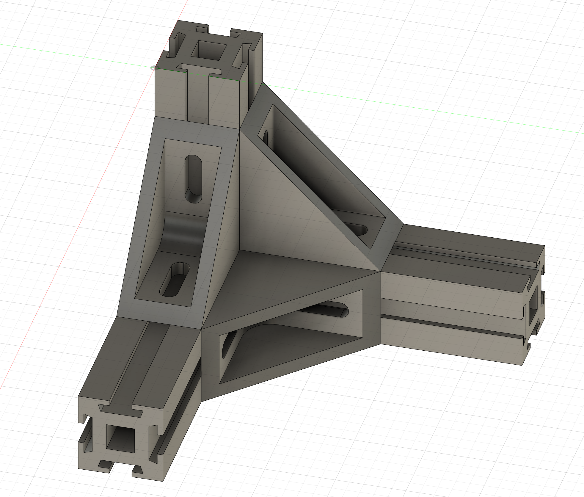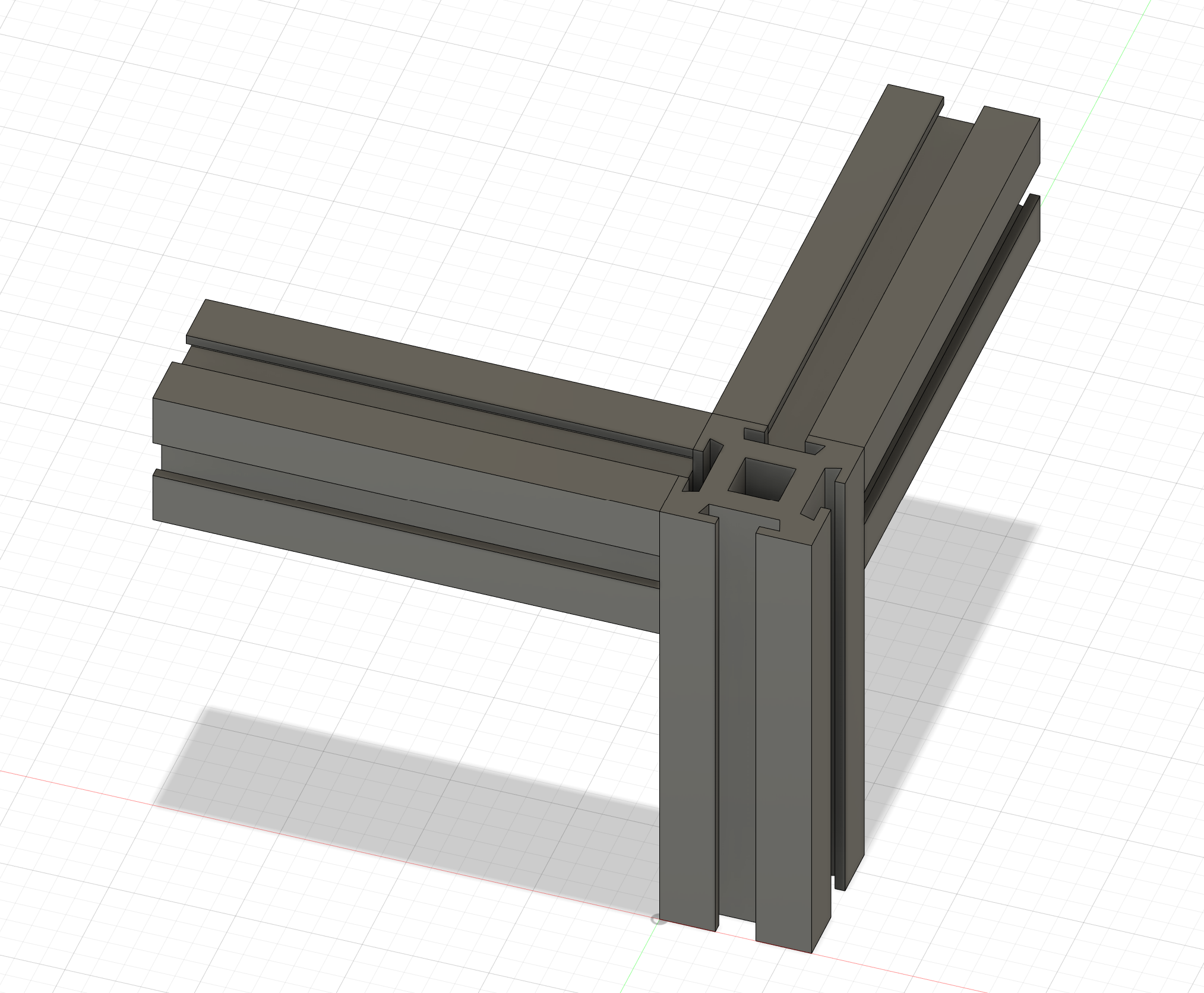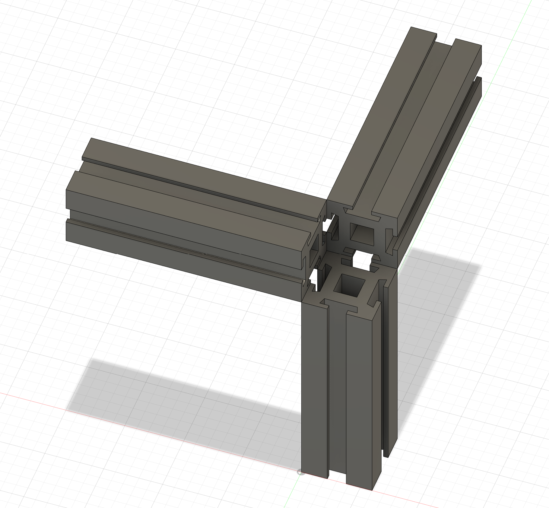 Да и не всегда этот нахлёст нужен. У меня в разработке сейчас очередной принтер. Размеры небольшие (стол 150х150), рама из обрезков профиля, оставшихся от других проектов. Отказ от нахлёстов позволяет экономить профиль, что очень актуально, учитывая ограниченность количества остатков материала. По 20 мм на угол, и вот уже 80 мм только на раме основания дрыгостола набежало. А углы, закрытые распечатанными угловыми заглушками, дадут дополнительную жёсткость за счёт входящих в пазы профиля выступов, и будут выглядеть даже симпатичнее нахлёстов. Внутри, разумеется, будут алюминиевые уголки для профиля. Как-то так это пока на макете: