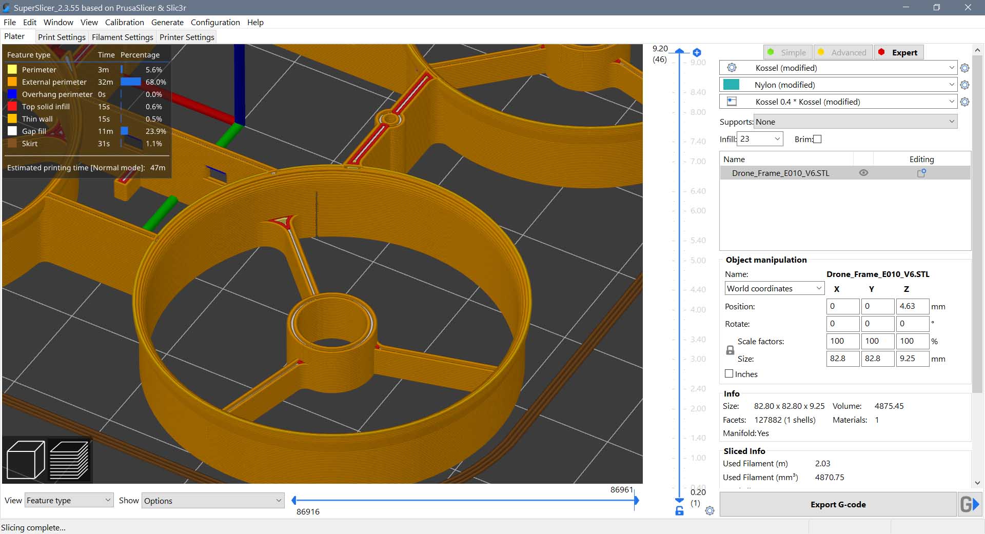 Как вариант, кстати, слайсер действительно сам режим вазы включил, увидев нулевое заполнение и стенку в один периметр. Для таких условий режим вазы самый оптимальный. Интересно, что выйдет, если увеличить толщину стенки до двух периметров, больше ничего не меняя.
