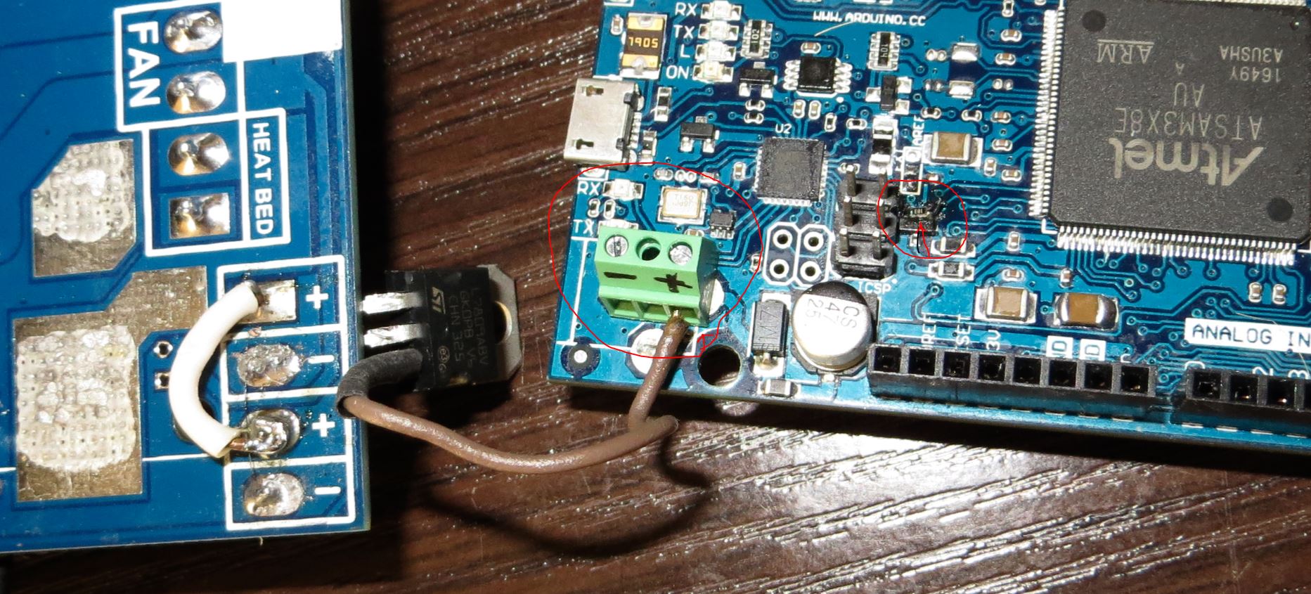 На плате DUE был выпаян разъём на 9 вольт и впаян винтовой разъём. Также было припаяно сопротивление 10 кОм . О сопротивлении читайте статью: