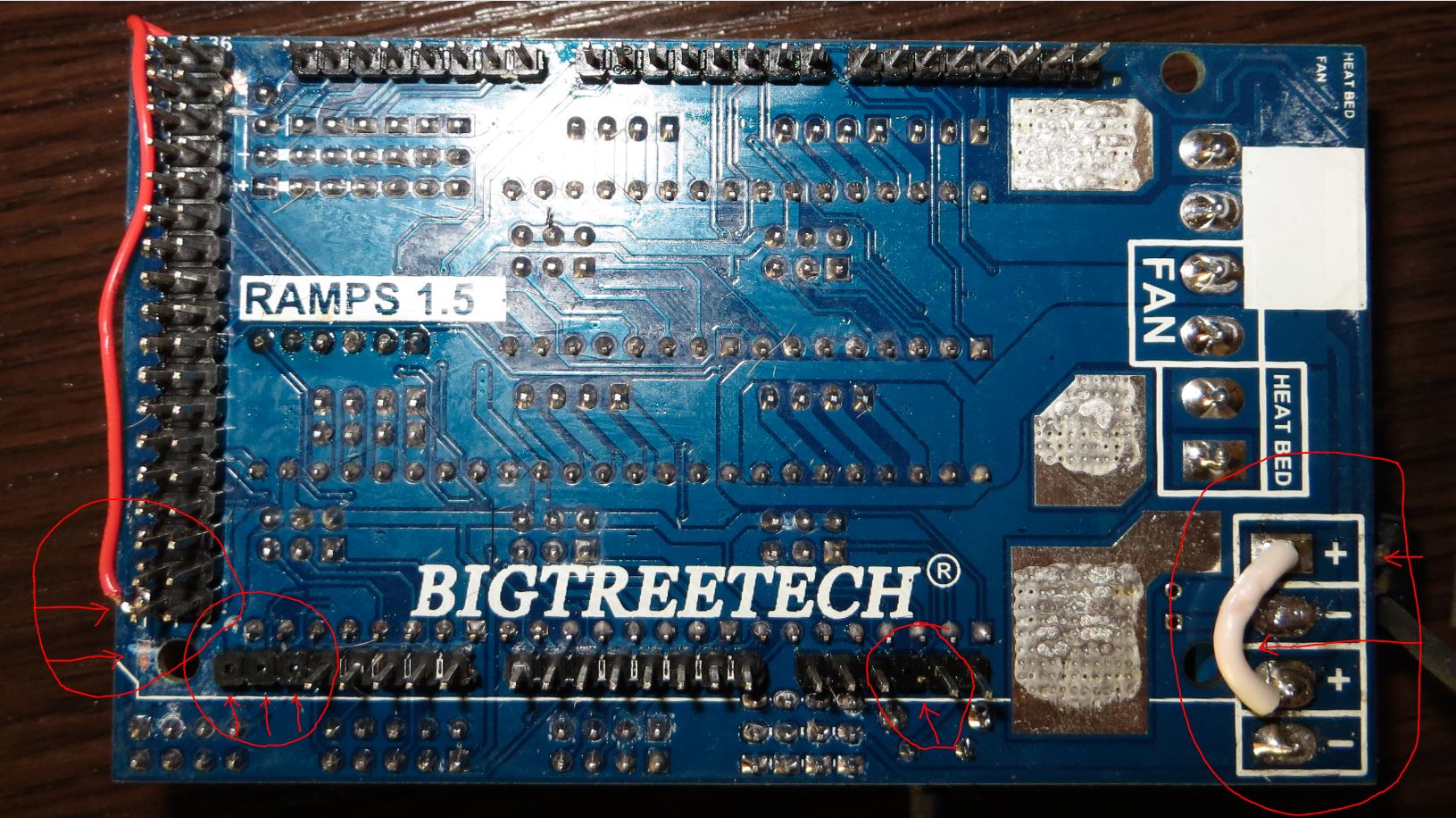 Остановимся более подробно на перепайке RAMPS. Так как в сети я не нашёл печатной платы RAMPS 1.5, то при переделках основывался на плате RAMPS 1.4 - так как подсоединительные контакты совпадают , то измерив прибором нужные точки на плате стало понятно, как её изменять. Внизу схема как изменять плату, на основе картинки RAMPS 1.4.