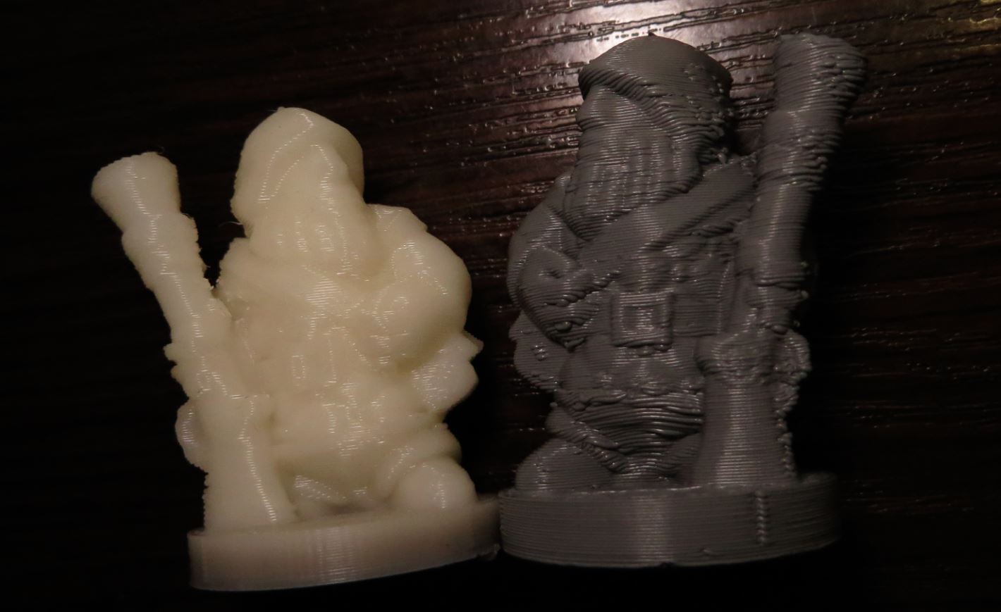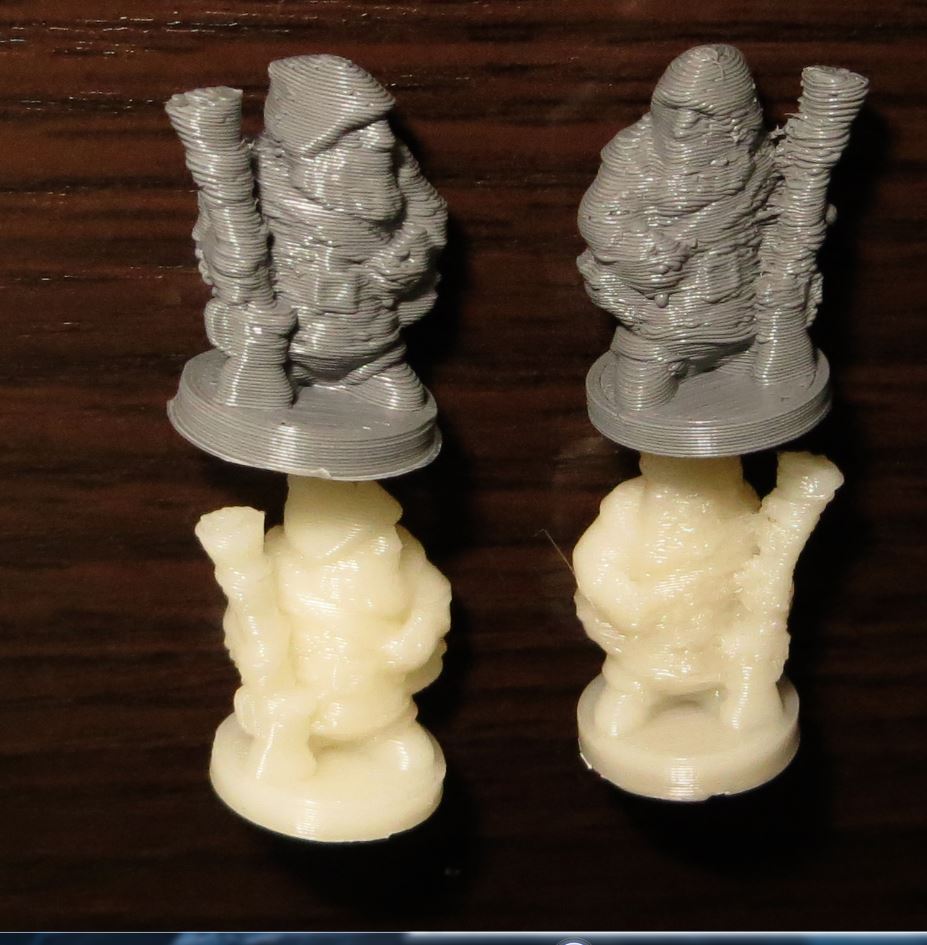 Вот два принтера - белый справа воин напечатан на первом принтере (смартрапкоре на рельсах) , второй с той же карты и с той же самой прошивкой только шаги на Z поменены, напечатан на собираемом СПринтере ПРО.