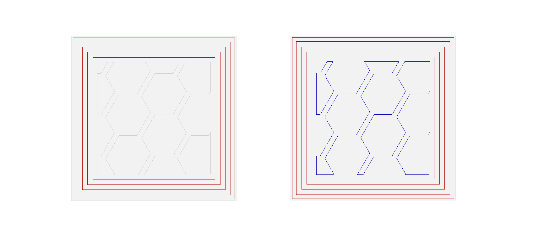 В итоге куча ниток, под которыми нет опоры аж три слоя. Поэтому и сказал, что лучше заполнение "соты", там под каждой линией есть опора через непечатаемый один слой. Понятно, что давит он сразу на два слоя пластика, но это работает с заполнением сотами.