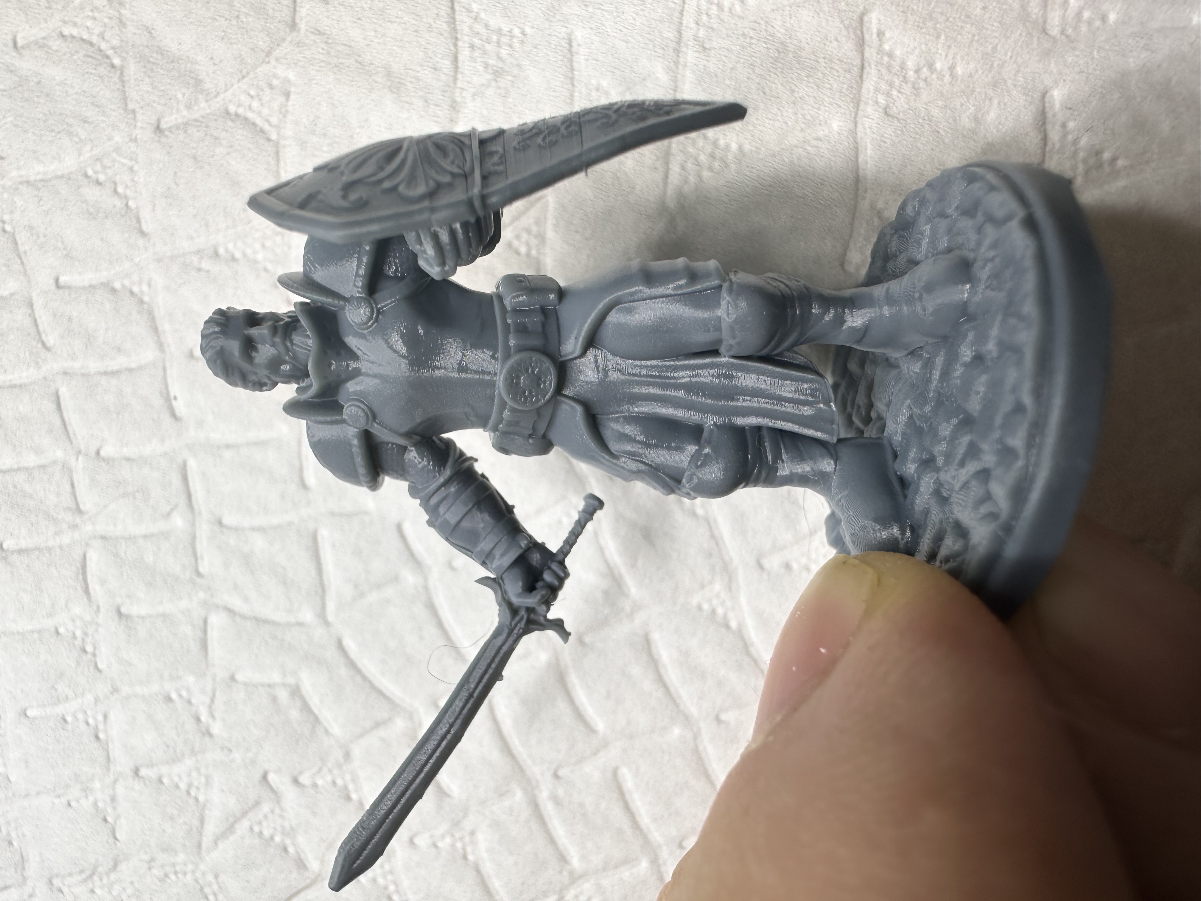 причём отрываются не все модели на столе а выборочно, модели тяжелее держаться нормально а лёгкая модель как на пример подставка под днд фигурку, может оторваться или на модели отрываются поддержки руки или ноги или другой мелкой детали, а сама фигурка держится и отпечатывается нормально. как пример сама фигура напечаталась нормально, а у щита оторвало поддержки и он съехал.