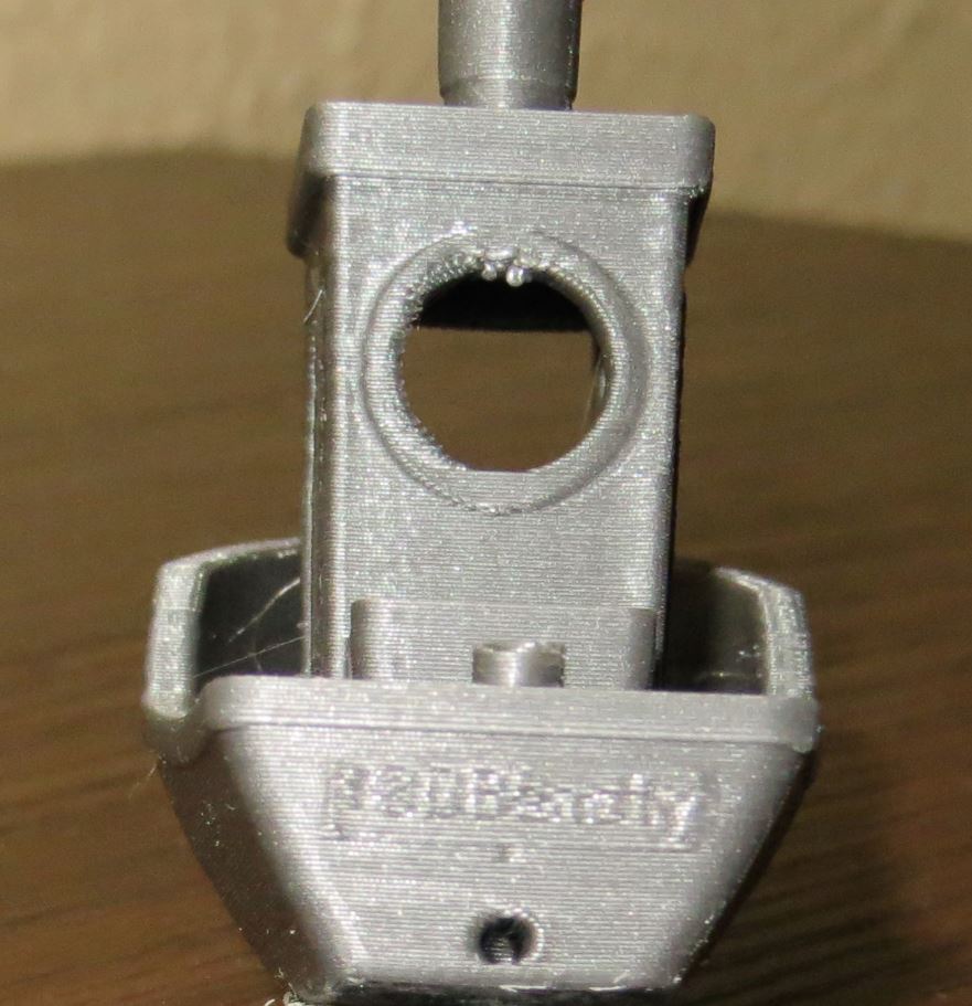 Когда механика запустилась как надо и была произведена первая печать - деталька вылезла оплавленная и сопливая. Вот фото цанги от фитинга. Печаталось с одного файла на одном и том же месте, поэтому на первый слой не обращайте внимания - пластик просто на стекло кидался без клеящего слоя.