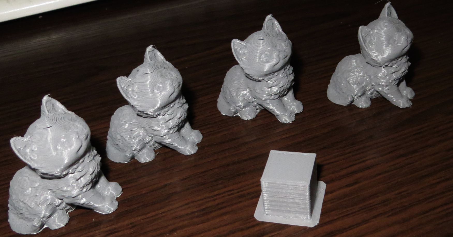 Вот фото котят - 8 бит - (без всяких улучшений - прям из коробки), 32 бита, перепаянные провода и заменена шестерня экструдера, и утепление Хот-енда. Два фото, чуть с разных ракурсов. Да у же на фото увидел , что порядок перепутан. Не пропечатанные кольца на лбу - позволяют мне почти точно определить когда был напечатан котёнок. Модель одна. Перекалибровку после утепления хот-енда не делал. Увеличение по высоте где-то в 4 раза. Кубик для масштаба - 15 мм сторона. Большую часть дефектов видно только на фото под увеличением. Вот кубик на глаз ровный, а на фото - свет от фотовспышки выявил и тенями усилил "неровность" поверхности". Котята на глаз , уже с сантиметров 30, отличий вообще не видно. И это говорит о том, что принтер печатает СТАБИЛЬНО, а косяки - надо просто настройки слайсера под этот принтер подстроить. Хороший принтер получился. СПАСИБО АНДРЕЮ.