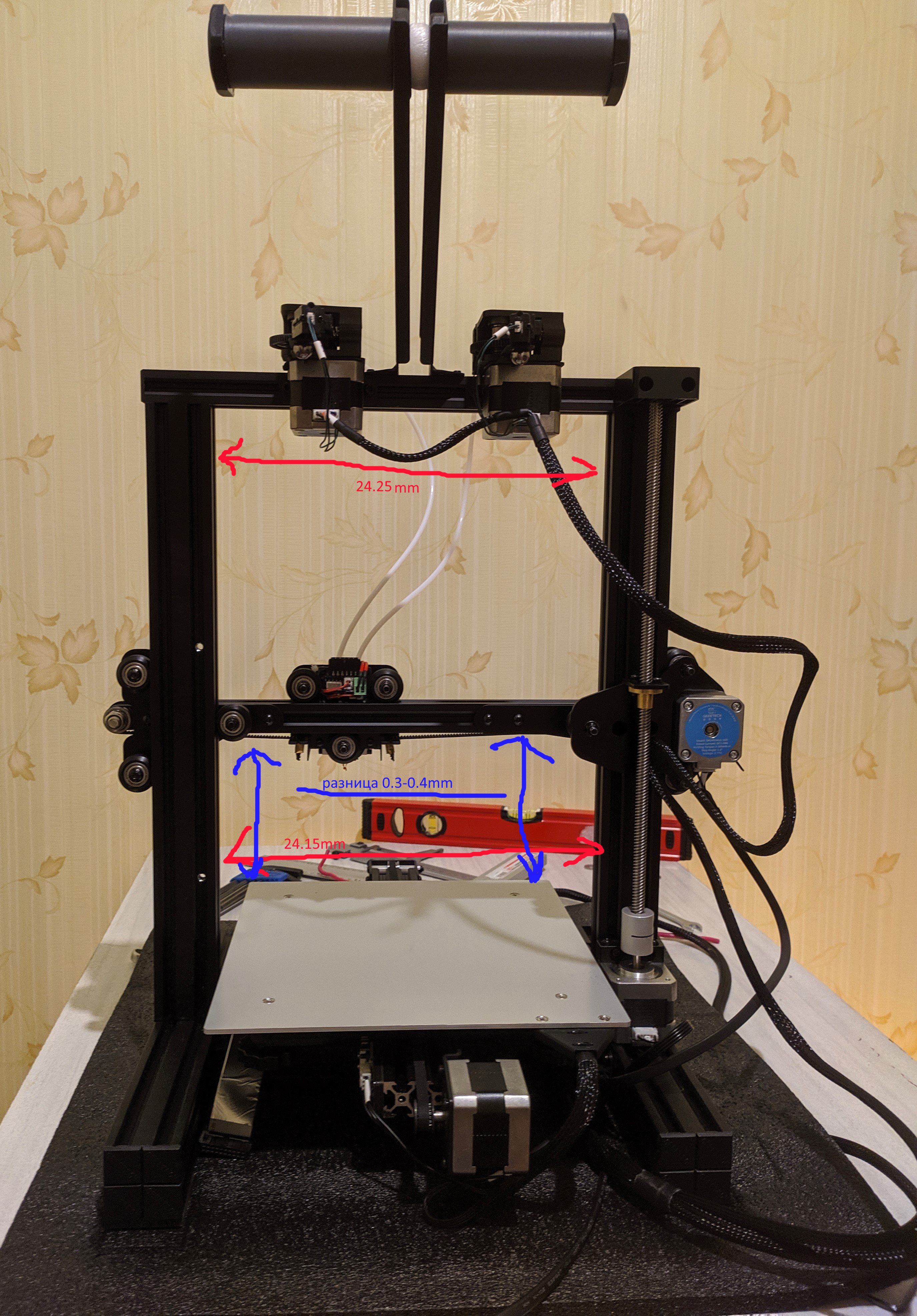 Перебрал всю геометрию, ось X паралельно верхней планки и одинаковые растояния до основы, вертекальные направляющие паралельно друг другу. Получились небольшая разница на концах направляющих, примерно 0.3мм. Думаю это будет достаточно?