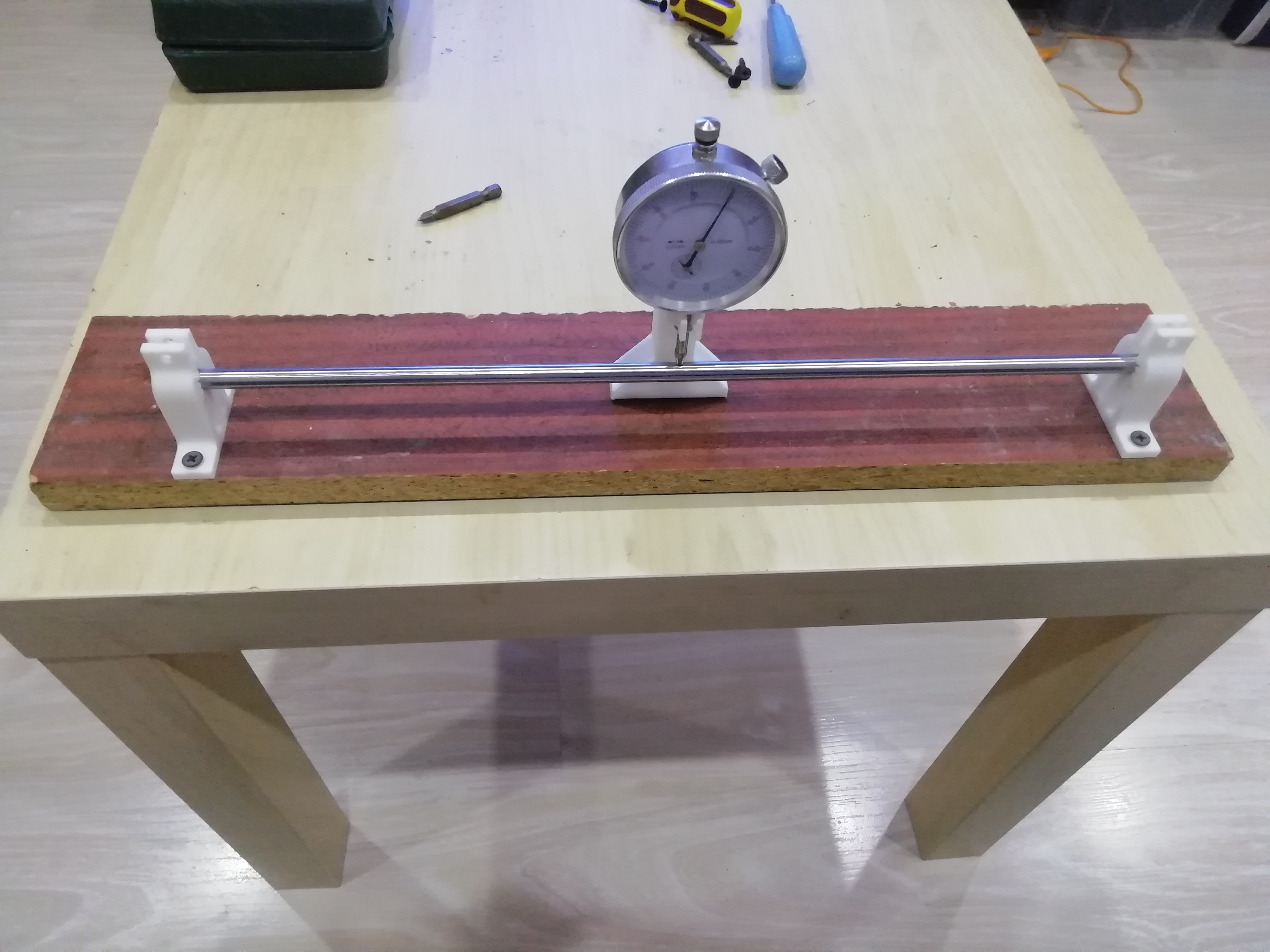 Решил проверить валы на кривизну. Собрал приборчик. Померил. Ужас. Из шести валов только на одном биение составило 0,1 мм на остальных доходило до 0.5 мм