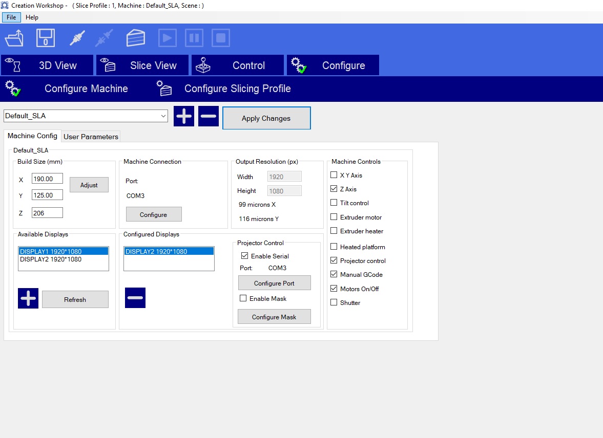 Всем привет, только начал вливаться в ваши ряды, и тут же наткнулся на такую проблему. Забрав у отца купленный 5 лет назад 3d-sprinter DLP PRO, попробовал его подключить и начать печатать, но как всегда что то пошло не так, сначала глючили моторы , проблема была в питании поменял блок питания, решилось. Потом следовав инструкциям с этого форума, прошил ардуино, поставил драйвер.В программе GRBL controller все подключается реагирует на кнопки и ползает (ракель, стол). А вот дальше собственно суть проблемы, в Creationworkshop не могу нормально все настроить, оси не реагируют на кнопки и при запуске печати проэктор светит а оси молчат как партизаны.