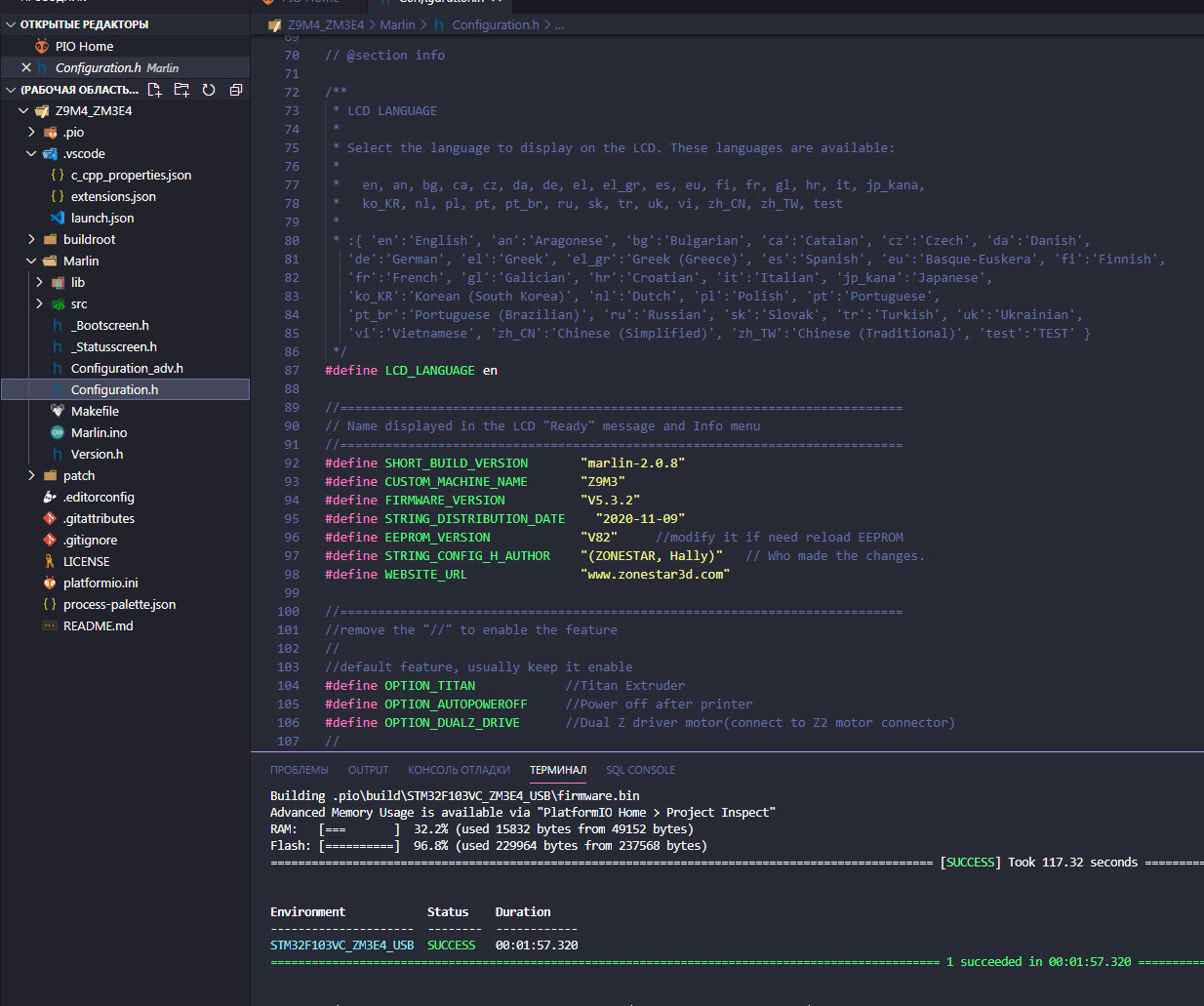 я скачивал с гитхаба прошивку 20007 и в нее вписывал данные из прошивки зонестара, не собиралась она, но уже точно не помню почему. Может я в то время что-то не правильно вписывал...Ну да, так оно и есть https://github.com/ZONESTAR3D/Z9/tree/m ... Sourcecode. Китайцы подрезали официальную прошивку, добавили поддержку именно этого контроллера и платы, остальное тупо выкинули. Теперь "их" прошивка поддерживает только их платы. Что они оттуда выпилили, знают только они. На первый взгляд они даже выпилили из прошивки поддержку драйверой TMC как по SPI так и по UART интерфейсу, остался только режим Step/Dir. В принципе немудрено, ожидаемо