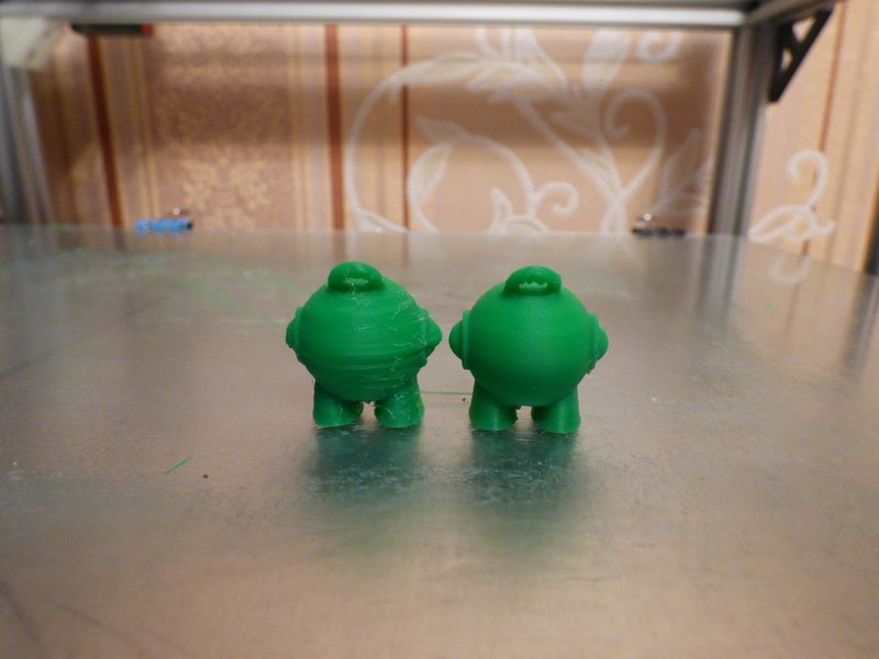 Ну вот, сделал сравнительную печать марвина на прошивках марлин и смузи. На всех фото слева печать на марлин 2.0.х, справа смузи. Условия печати, настройки прошивок идентичные, ПИД регуляторы стола и хота на обеих прошивках отавтотюнены, печать сразу двух экземпляров марвинов в разных углах стола, т.к. при печати одного слои не успевают остывать и края на свесах подгибает. Г-код в одном тесте идентичен, в другом в слайсере выставлены соответствующие настройки, для какой прошивки гнать Г-код. Результат идентичен. Плата MKS sBase на LPC1768.