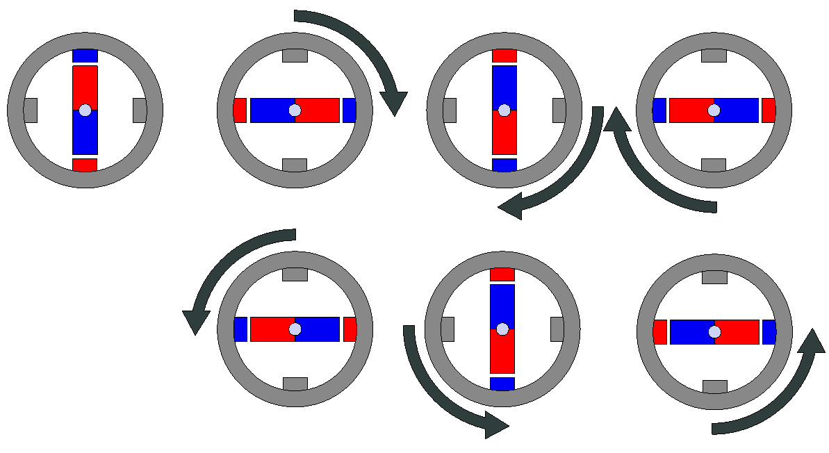 2. Подаём ток на вторую обмотку, и одновременно снимаем с первой. Ротор, повинуясь законам магнетизма, шагнул на 90° по часовой стрелке, встав горизонтально. А если концы второй обмотки поменять местами, то, вполне ожидаемо, шагнёт против часовой (нижний ряд на рисунке).