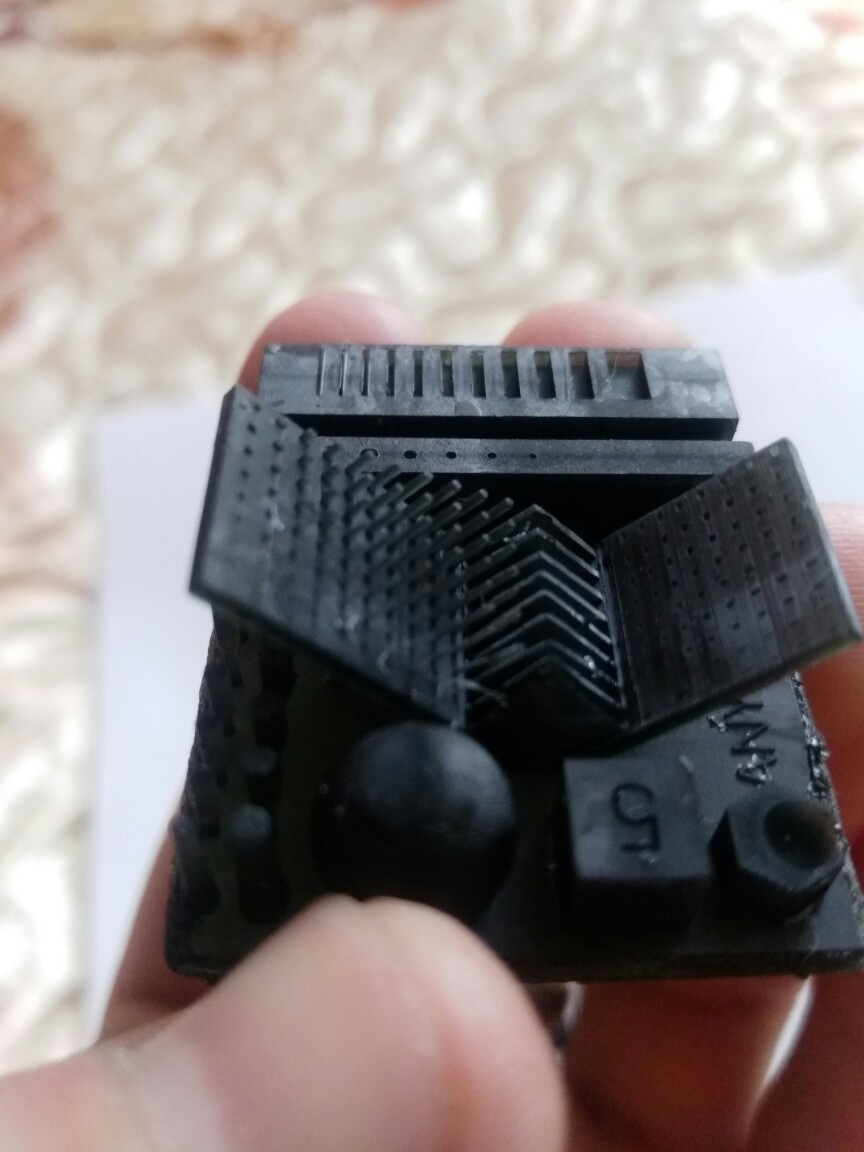 Собственно, всё начиналось с темы viewtopic.php?f=5&t=1215&p=58831#p58831 , где после приобретения б/у фотополимерника, я решил сразу отпечатать тестовую модель, и столкнулся с неприятностями. Как я понял, во время печати в нескольких местах были разрывы, из-за чего в итоге весь процесс пошёл наперекосяк. Я дал принтеру отстоятся сутки, немного полирнул планку оси z (убрал заусенцы, теперь они не чувствуются, поверхность гладкая на ощупь), хорошенько взболтал смолу, профильтровал её, дождался пока пузырьки останутся только на поверхности в малом количестве. Заново откалибровал положение оси z, запустил печать тестовой модели R_E_R_F.
