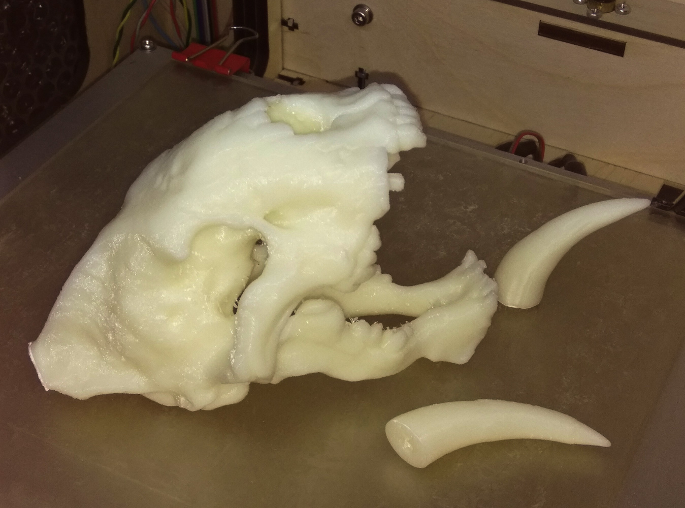 а теперь не много шока, дело в том что я печатаю все время АБС и PLA для меня не характерен, и при попытке работы им я наткнулся на постоянный клин нити в моем боудене, который надо сказать имеет длину 500мм как только не мучался и прижим уменьшил и нить сушил не помогло , не мно улучшилась ситуауция (3 я попытка напечаталось около 30% модели башки, до этого 1 см вылазил и все) когда я сделал ретракт в половину от нужного и в половину скорости, но все равно клинануло итогда я решил что мне не нужен ретракт, ну как бы почти ... в общем вот вам ШОК :