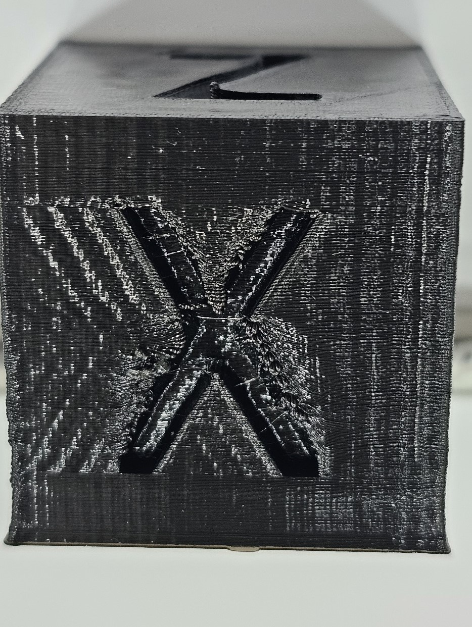 на стороне Х плюс ко всему еще и явный эффект эхо. на стороне Y буква смазана. сторона Z, сама буква вроде нормально пропечаталась, но поверхость последнего слоя как будто провалена в некоторых местах, там я кстати добавил в слайсере эффект разглаживания последнего слоя (типа как утюгом) без подачи пластика....