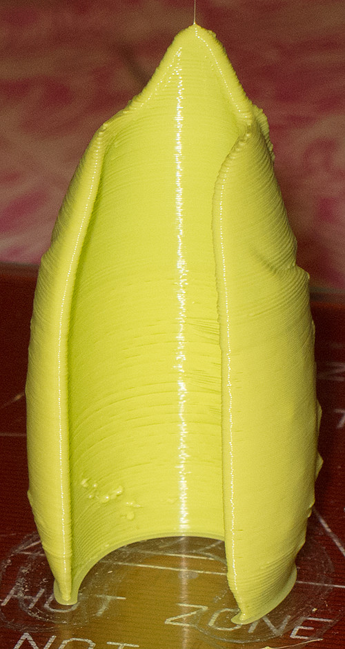 Начал печатать на температуре 230\80. Слой 0,15 мм. Низ получался волнистый. Снизил температуру до 220 и Flow до 90%. Включил обдув, как для PLA. Ближе к верху поверхность опять стала неровной. Ещё снизил температуру и общую скорость печати. Деталь не допечаталась.