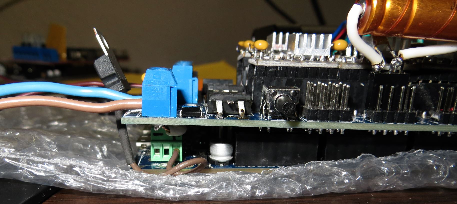 Питание сделал через стабилизатор L7809 - кренка на 9 вольт. Подпаял на контакты отсутствующего силового входа для Нагревателя столика - за две ноги " Вход" и "землю". А на ногу "выход" - припаял проводок. На плате Ардуино DUE выпаял круглый разъём на 9 вольт и впаял винтовой разъём. В этот разъём и подключил "+" на провод с выхода L7809. А земля у этих платок Ардуино DUE и RAMPS уже соединена. Не стал делать "земляную петлю" решил что и с одним проводом нормально будет. Между "входом и землёй" L7809 впаял керамический конденсатор 4,7 мкф. А на выходе (и это же вход на Ардуино DUE) стоит штатный конденсатор 47 мкф, на фото сбоку его видно . Поэтому ничего дополнительно ставить не стал. Ни какой радиатор вешать не стал, во первых, не греется, а во вторых, там места мало. Почти вплотную, к боковой стенке, получится.