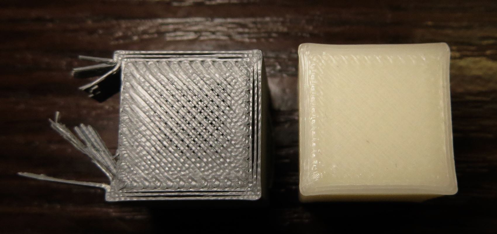 Вот ещё сравнение бесцветного и серого(металлик) пластиков. На Бесцветном все слои нормально скреплены между собой. А на сером металлик - нет бокового склеивания слоёв. Настройки одни и те же. Модель одна и та же. Температура оптимальная для серого пластика - для бесцветного я, обычно, выставлял на 5 градусов меньше, но тут напечатано на одной и той же температуре. У серого пластика, специально, распотрошил сбоку слои - они действительно не склеились.