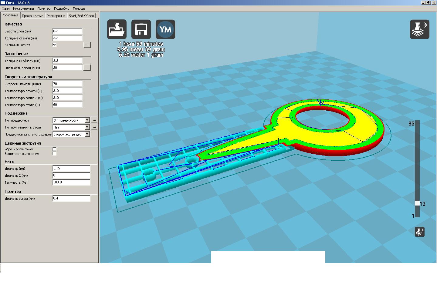 Кстати, я смотрю что поддержки другим экструдером печатаются? А почему толщина нити для него "0" стоИт? Может, из-за этого Кура с ума и сходит?