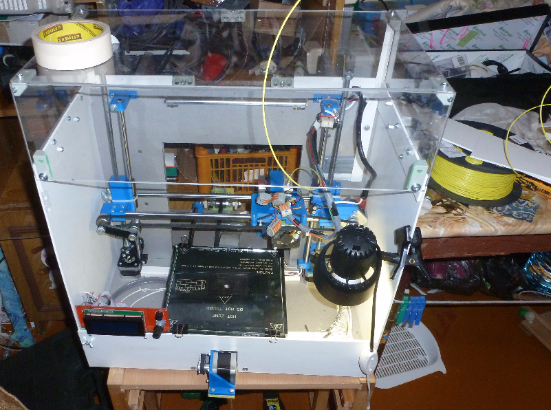 Самой востребованной печатнай деталью оказались пластиковые уголки из оригинальной конструкции менделя.,причем основная рама собрана без их использования.,напечатаны они были в разное время разным АБС пластиком,поэтому чтоб не устраивать из принтера радугу покрасил из баллончика акриловой краской все в серый.