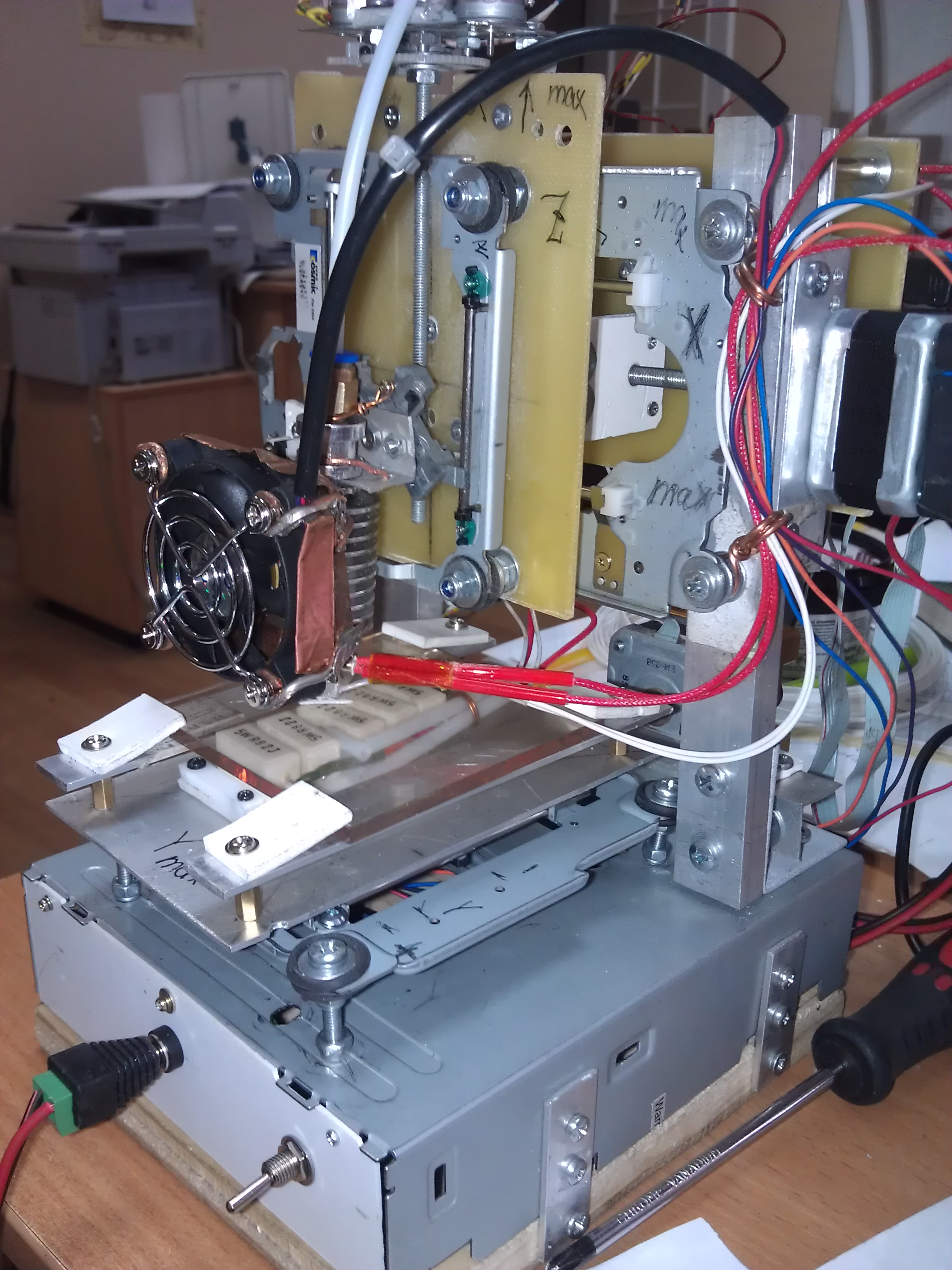 У меня 3д притер собранный из старых СD приводов . Начинка MEGA2560+RAMPS1.4 + Merlin-Standart . мне в этом форуме посоветовали поставить концевики , чтоб принтер понимал где находиться . В позицию HOME принтер идет без проблем в ручном режиме, так и во время печати в программах pronterface, Repetier-Host, Matter-Control. Проблему у меня такая. Во время печати после выхода голывы на позицию печати пластик не подаётся ....Когда проверяешь без печати в разогретую голову идет платить. И еще печатает только так , как показано на картинках. Зарание огромное спасибо...