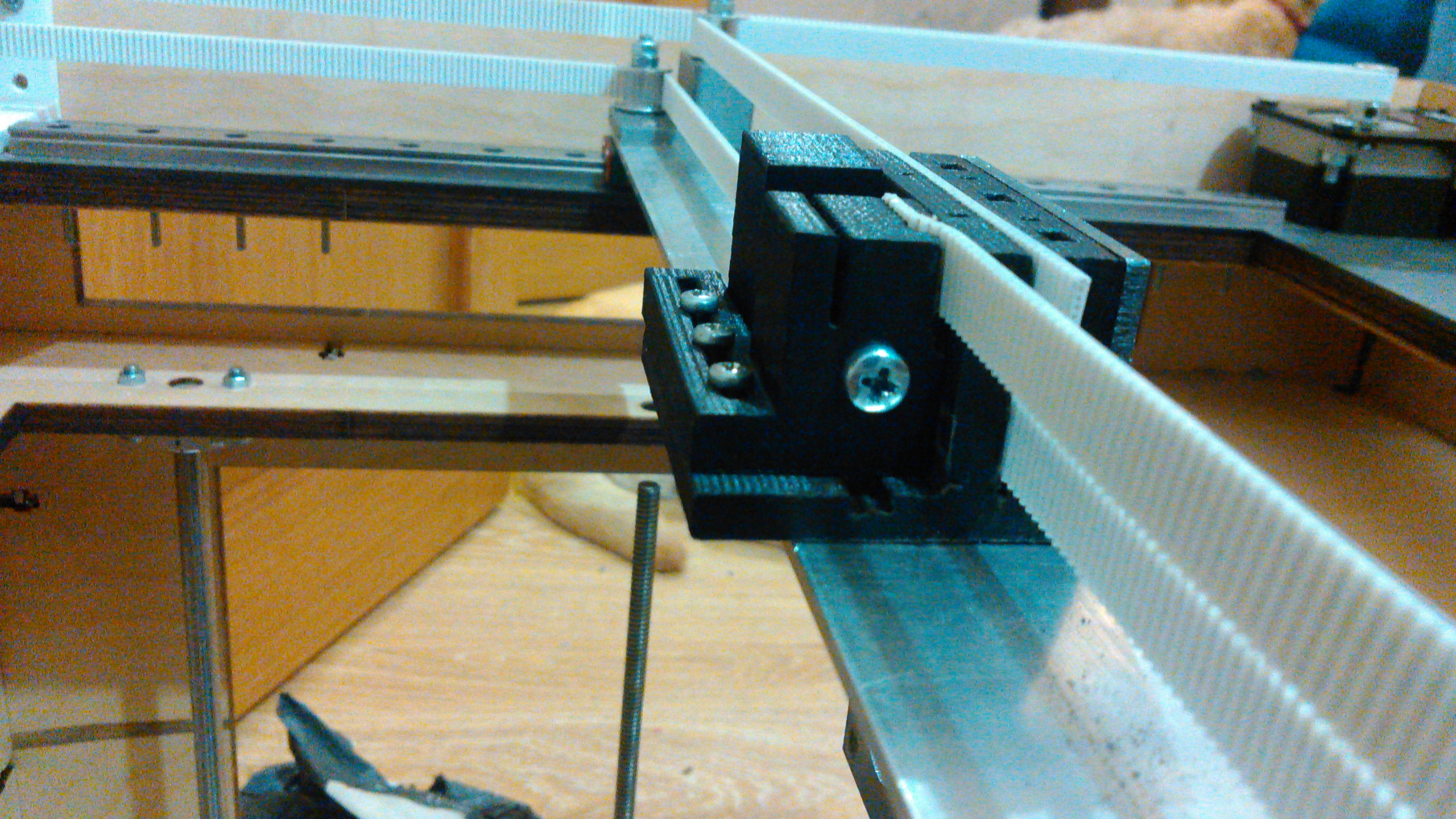 Из явных косяков - механизм натяжения ремня оси Z. Диапазон регулировки сильно избыточен, а из-за большой его длины получилась низкая жесткость на кручение. Пока убавил ток, но правильнее переделать.