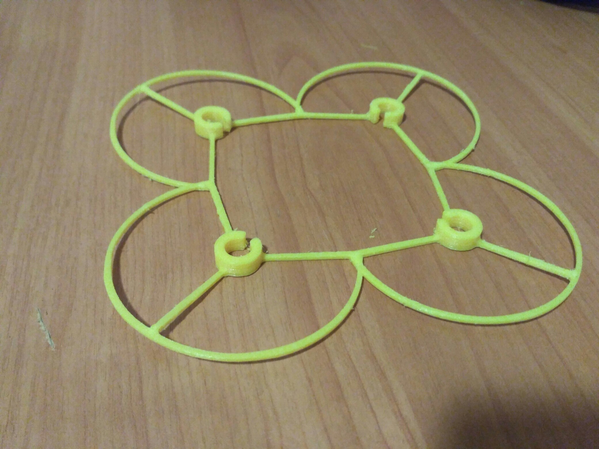 Пробовал печатать из триммерной лески Champion Ф1,6 из блистера. Деталь - защита винтов для миникоптера. Получилось достойно, для первого раза. Температура 260/110, слой 0,2. Печатал без ретракта и без предварительной просушки лески, поэтому много соплей. На фото уже большая часть соплей срезано.