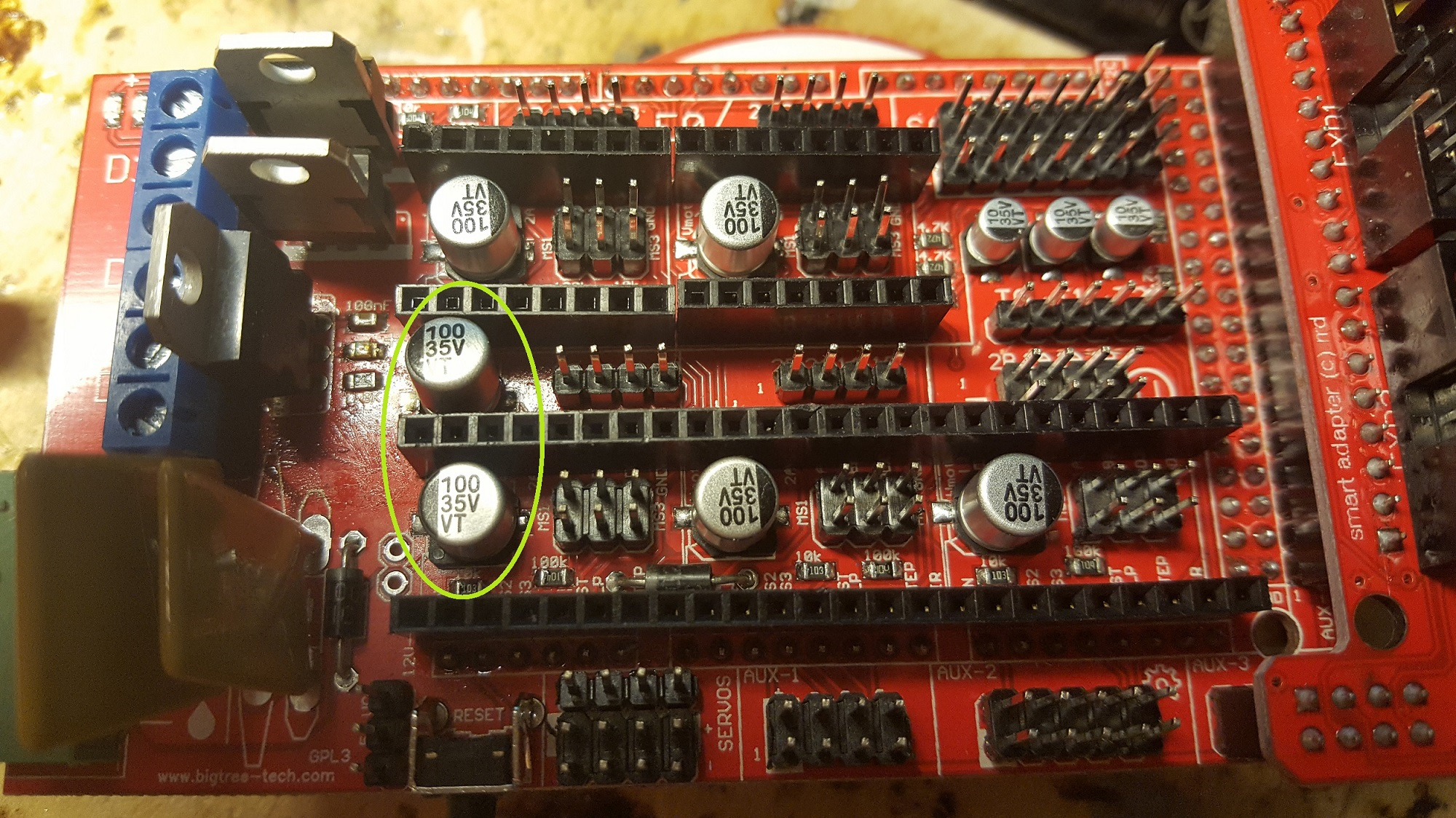 Беглый осмотр показывает - два конденсатора на РАМПСе впаяны с неправильной полярностью. Взорвался электролитический C6.