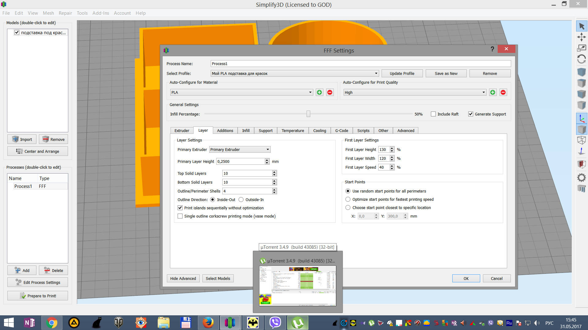 • First Layer Speed – скорость печати 1 слоя модели в процентах от основной скорости печати слоев модели.