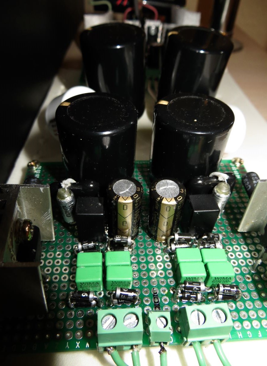 Что мы тут видим? На входе стоят два больших, красивых, аудиофильских бочонка Боверс-Вилкинс на 10 мКф. Поставлены они там явно для привлечения аудиофильского внимания, но с технической точки зрения они там не нужны и даже вредны. Я об этом писал здесь viewtopic.php?f=30&t=578#p17033 :