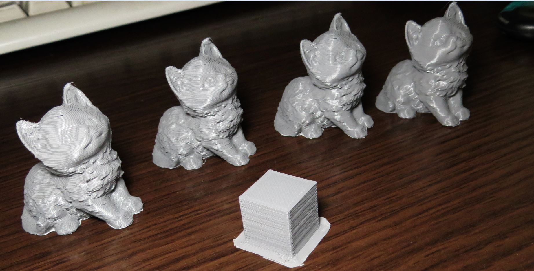 Вот фото котят - 8 бит - (без всяких улучшений - прям из коробки), 32 бита, перепаянные провода и заменена шестерня экструдера, и утепление Хот-енда. Два фото, чуть с разных ракурсов. Да у же на фото увидел , что порядок перепутан. Не пропечатанные кольца на лбу - позволяют мне почти точно определить когда был напечатан котёнок. Модель одна. Перекалибровку после утепления хот-енда не делал. Увеличение по высоте где-то в 4 раза. Кубик для масштаба - 15 мм сторона. Большую часть дефектов видно только на фото под увеличением. Вот кубик на глаз ровный, а на фото - свет от фотовспышки выявил и тенями усилил "неровность" поверхности". Котята на глаз , уже с сантиметров 30, отличий вообще не видно. И это говорит о том, что принтер печатает СТАБИЛЬНО, а косяки - надо просто настройки слайсера под этот принтер подстроить. Хороший принтер получился. СПАСИБО АНДРЕЮ.